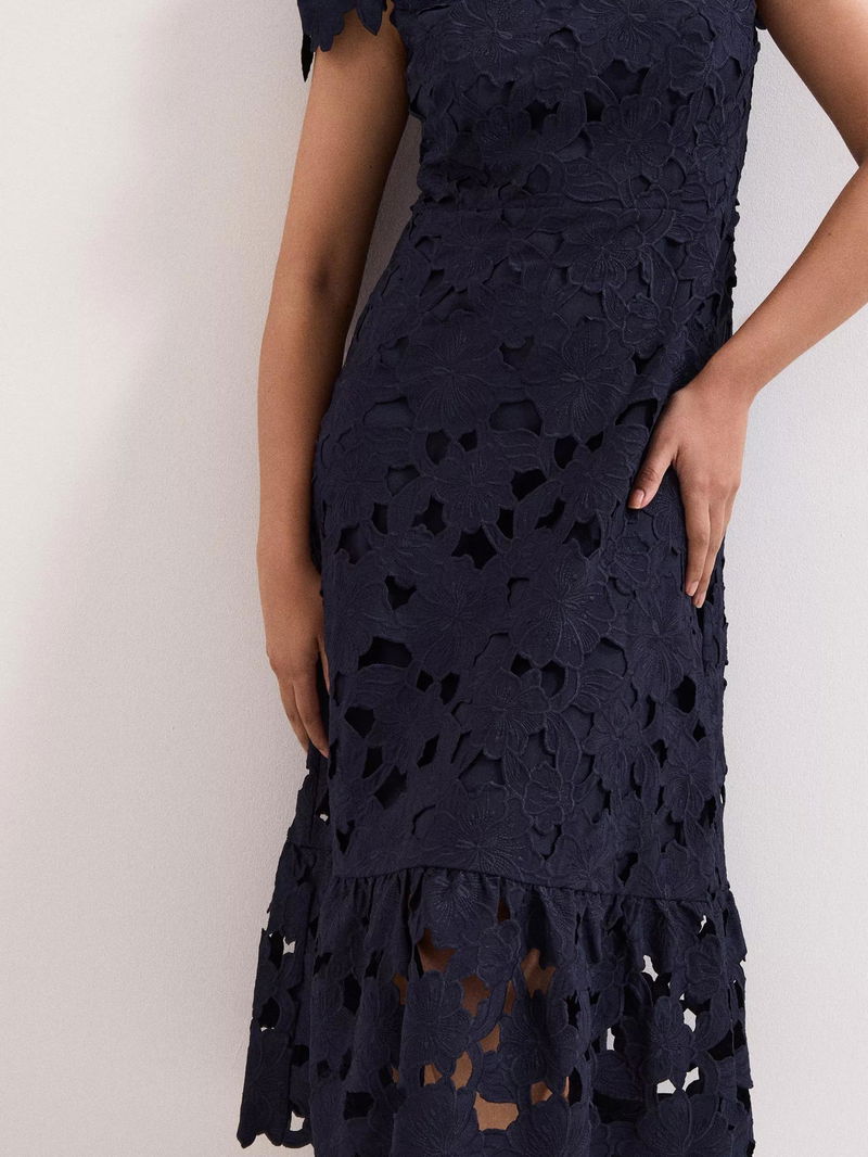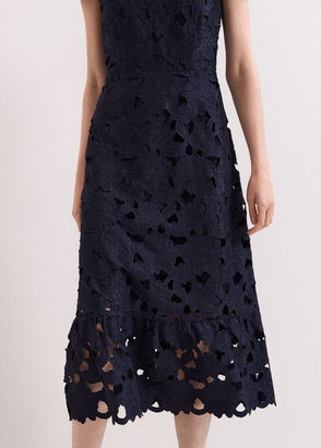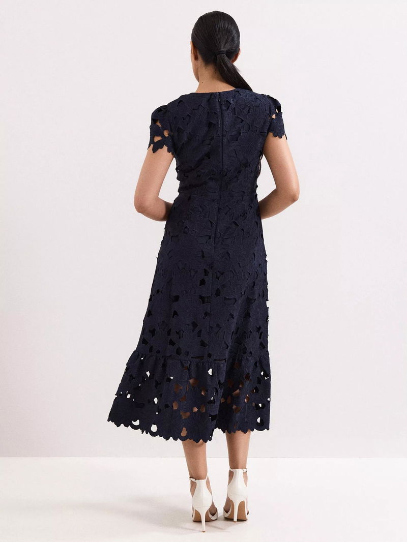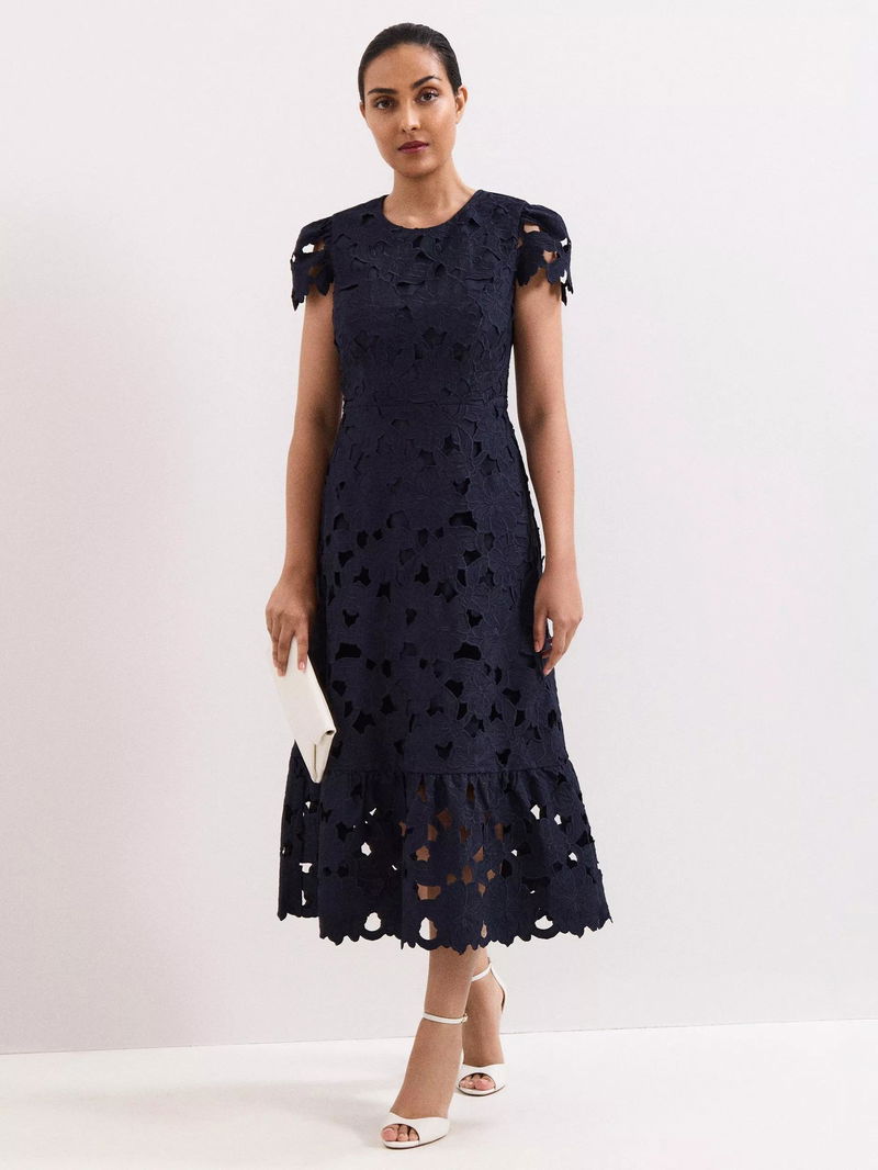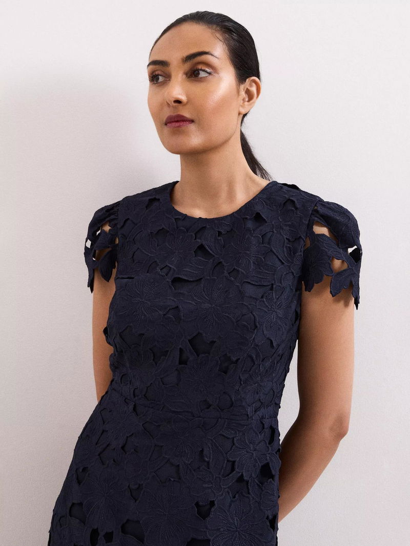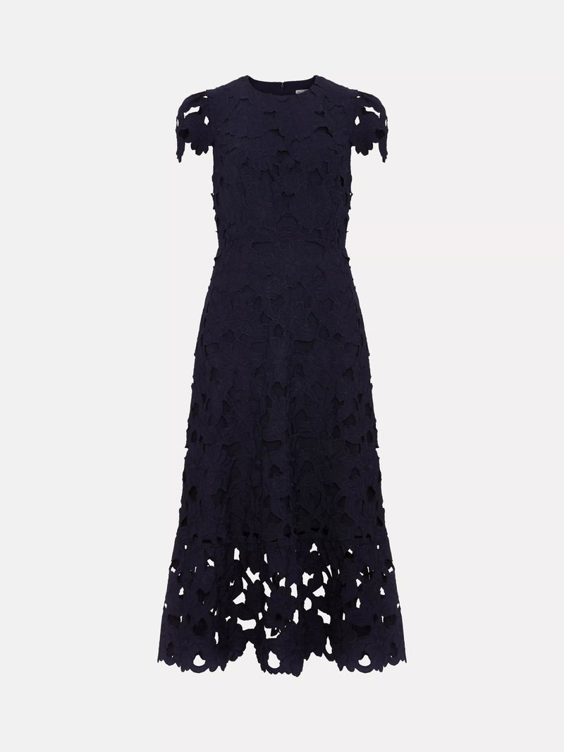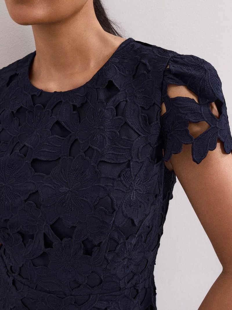 This elegant petite midi dress flatters with a fit and flare silhouette, a delicate floral lace overlay, and round neckline. With an easy concealed zip for comfort, making every occasion feel special.
