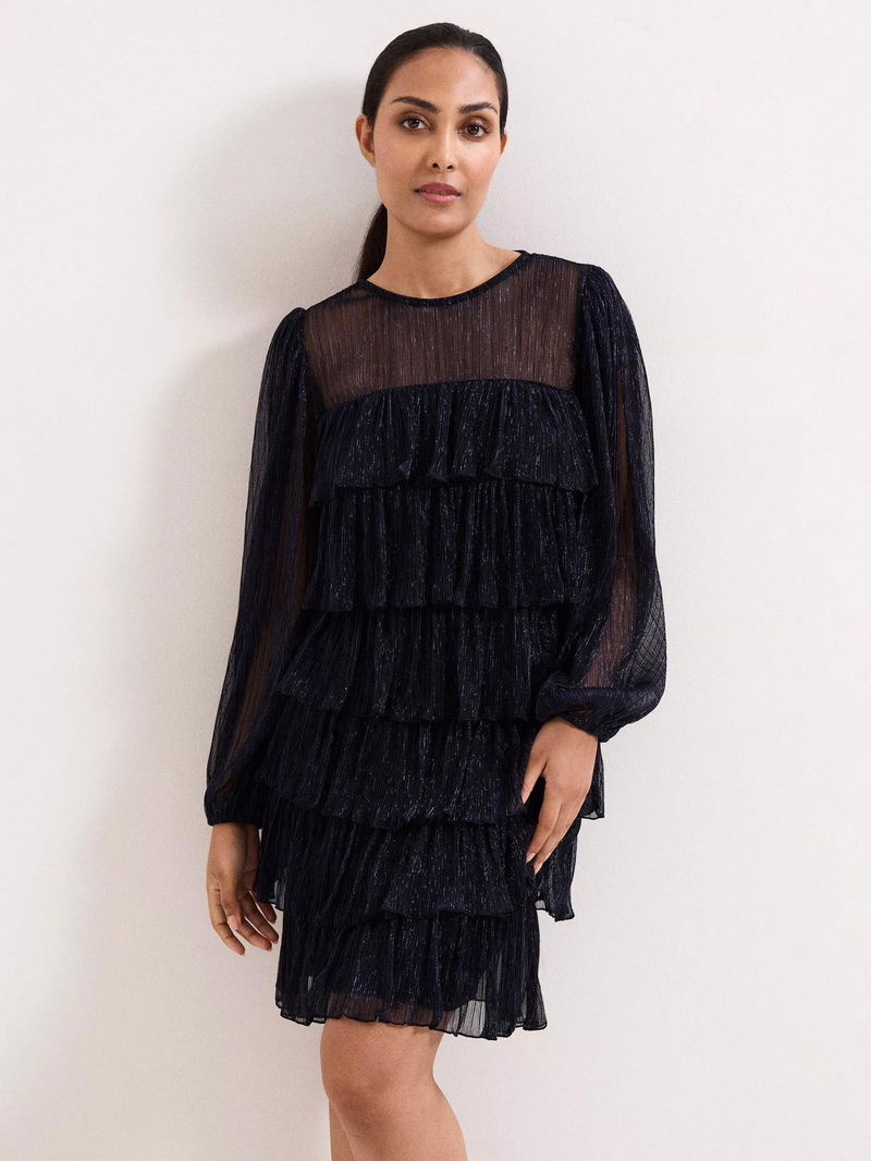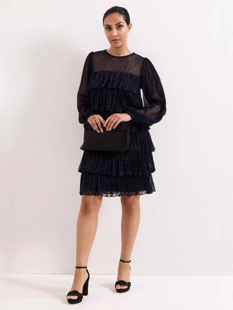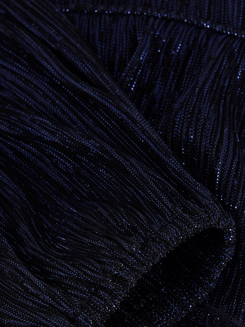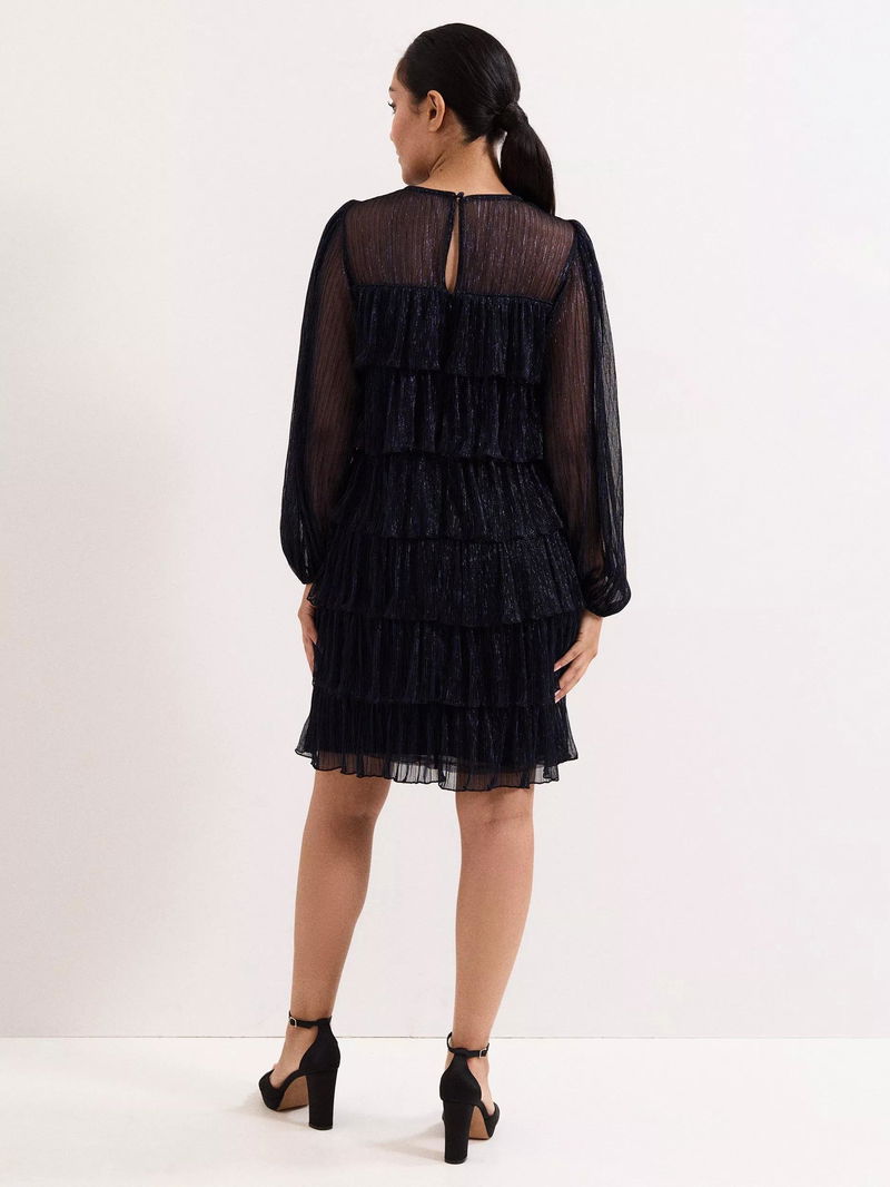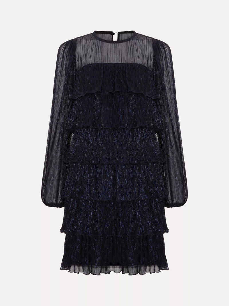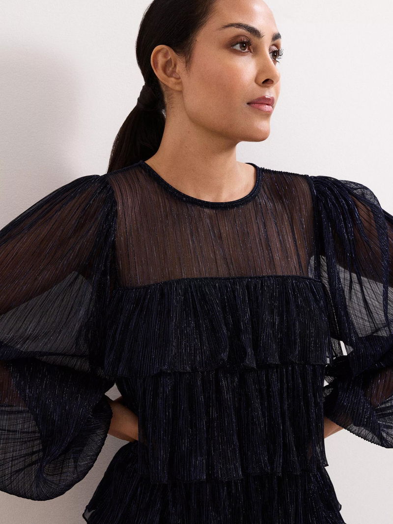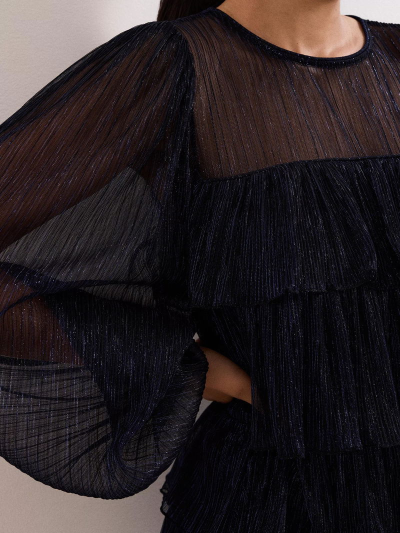 Guaranteed to make a statement in this navy mini dress. Elevated design details include semi-sheer blouson sleeves and tiered ruffles throughout for subtle volume. Shimmering silver plisse catches the light with every little movement, perfect for dancing the night away at parties and events. Keep it simple with silver heels and a matching clutch for the perfect party look.