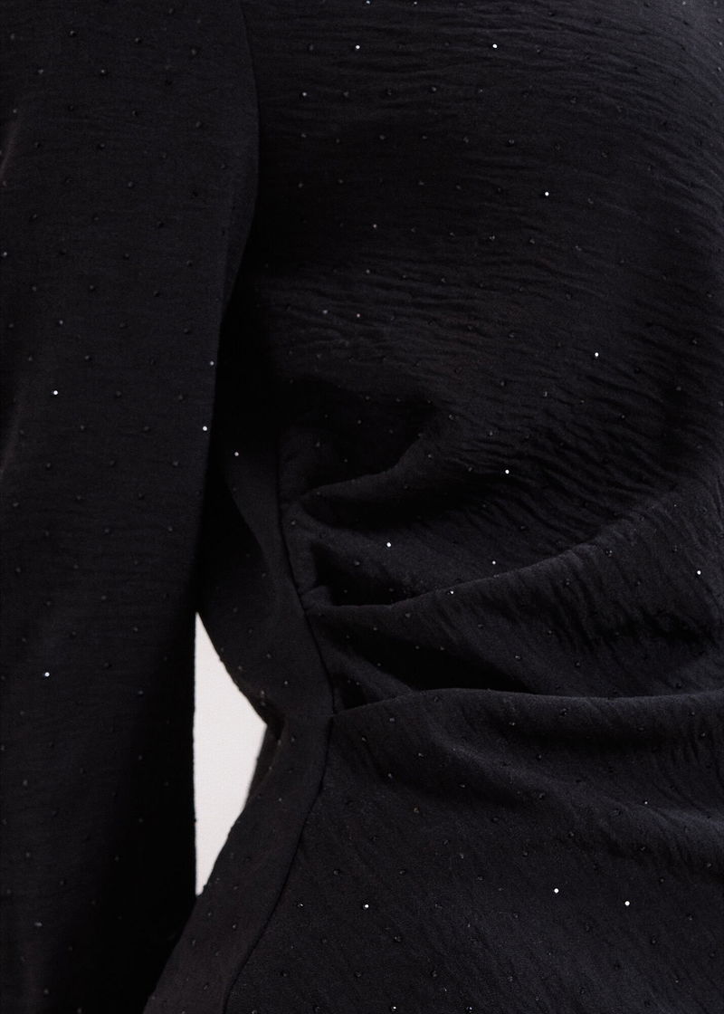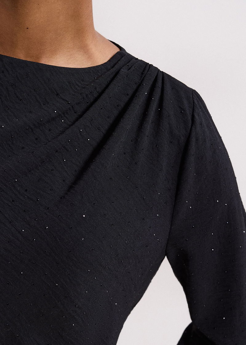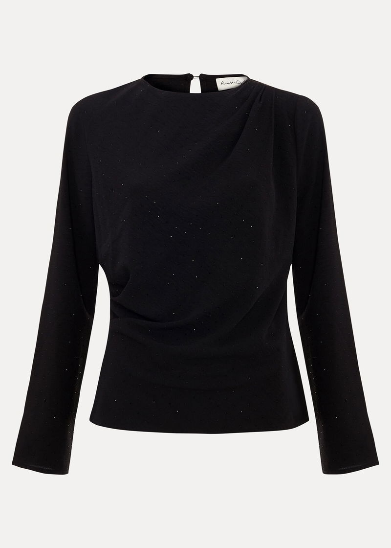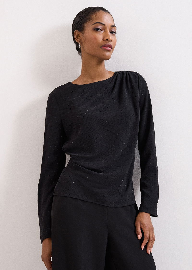 Your new go-to evening style. This black drape top features a modern slash neckline, a sophisticated draped silhouette and subtle specks of shimmer. Style with matching trousers, heels and clutch for a chic monochrome look, making you ready for every weekend and evening plan.