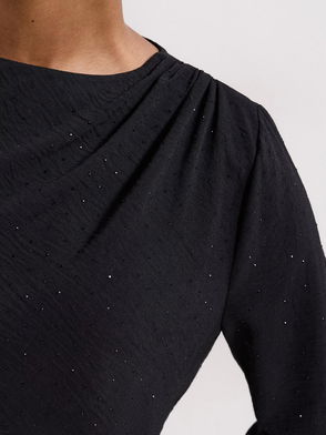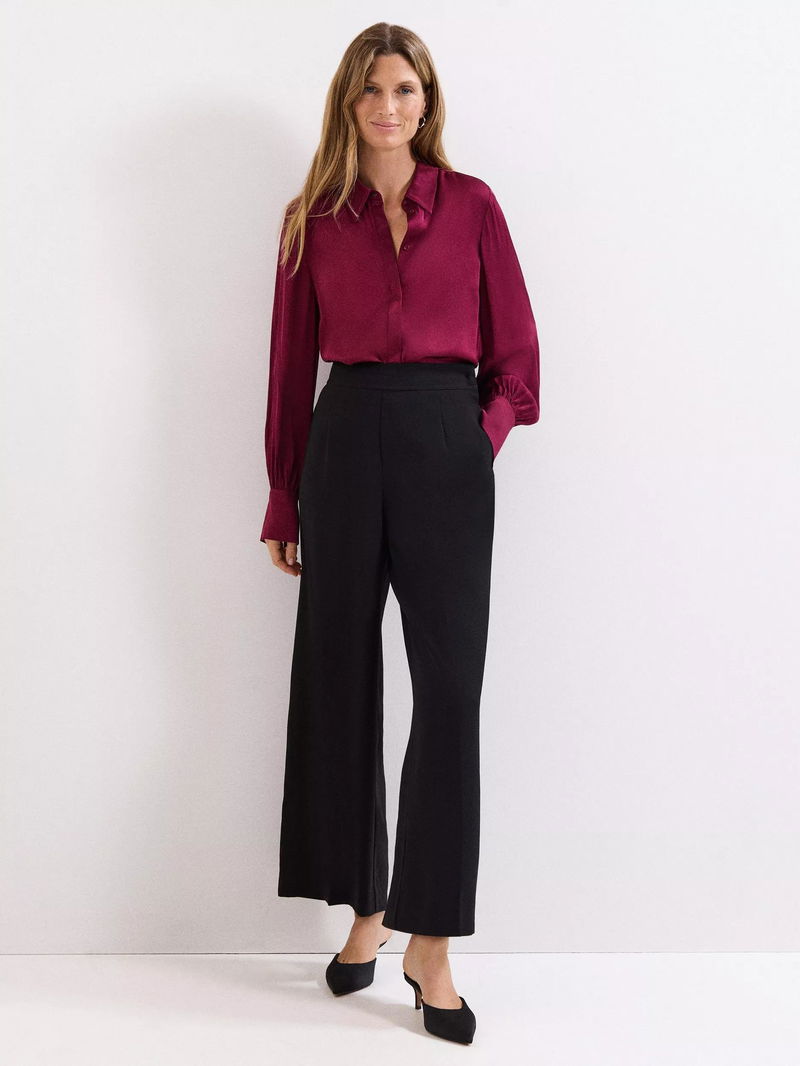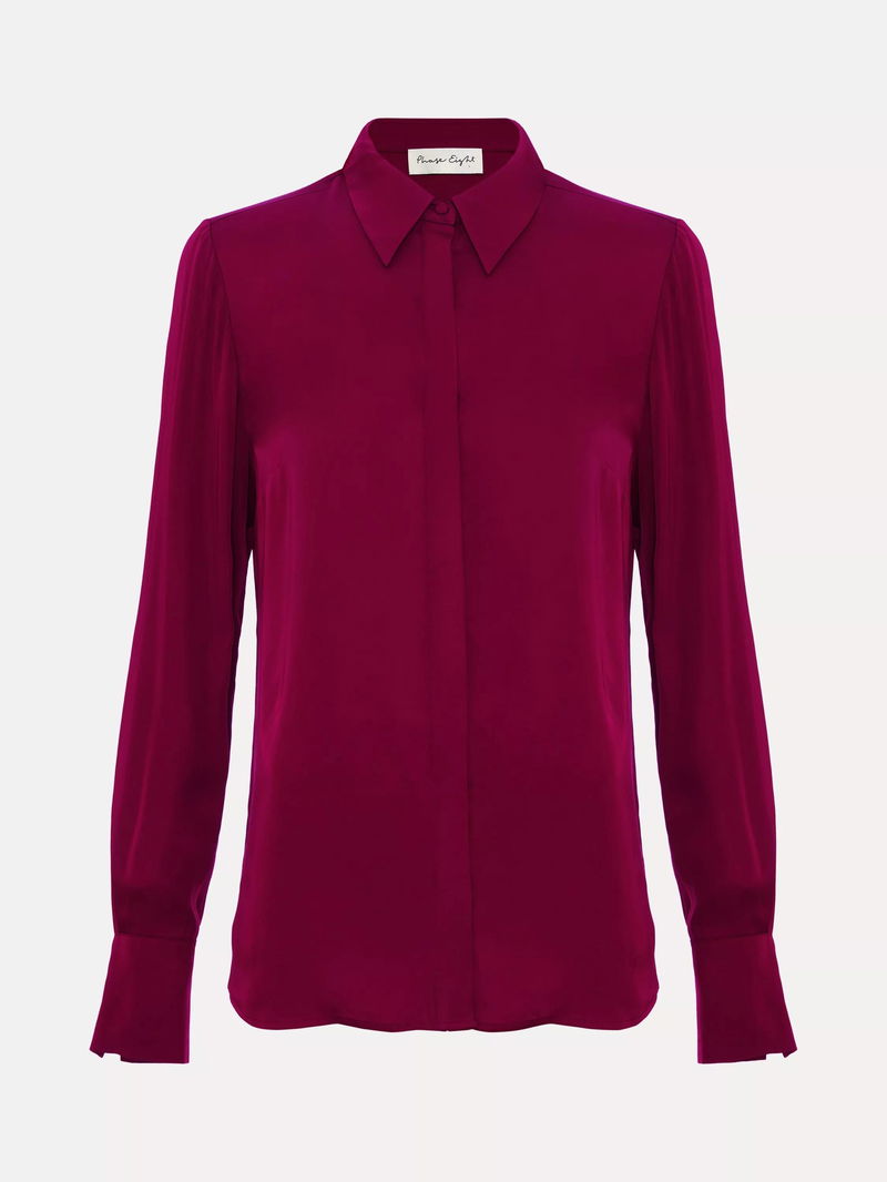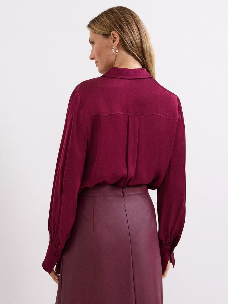 This satin shirt is a premium wardrobe staple. Cut from smooth satin for a sensual feel, the sleeves are punctuated by subtle ruching and statement, oversized cuffs. Add tailored black trousers for a pared-back look.