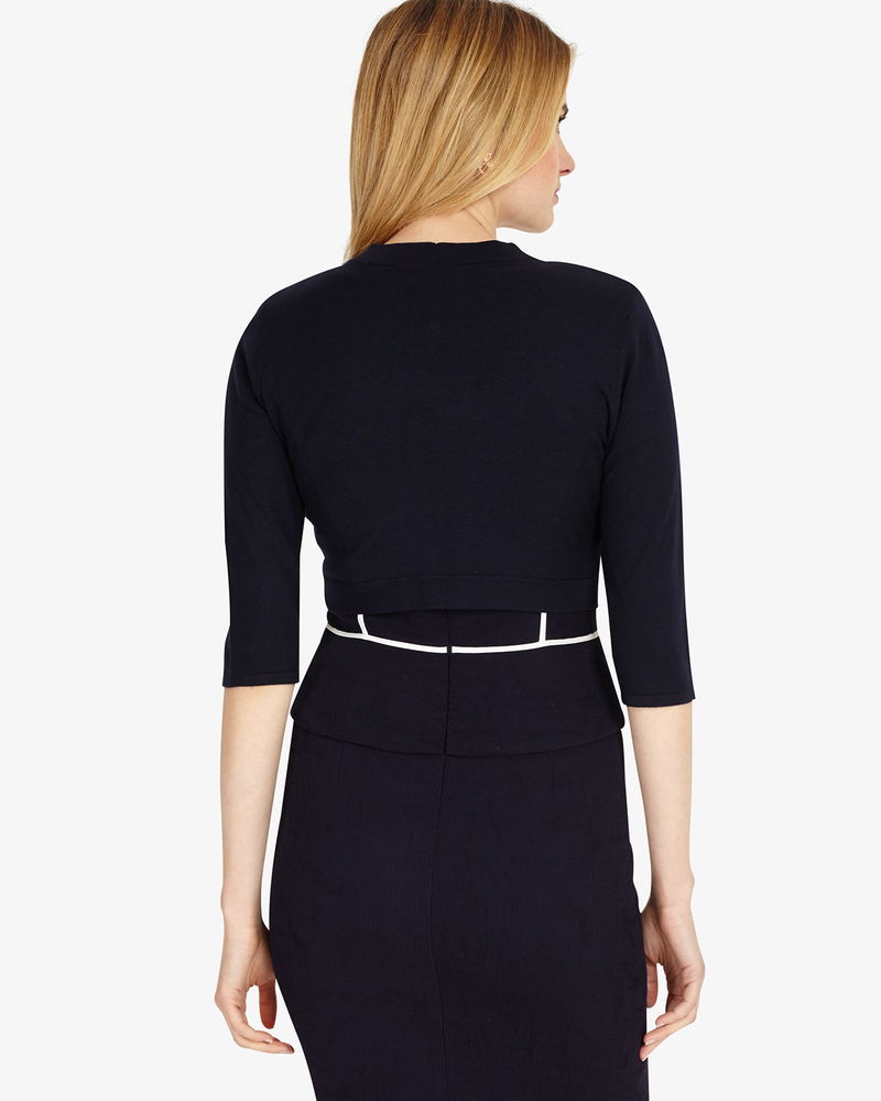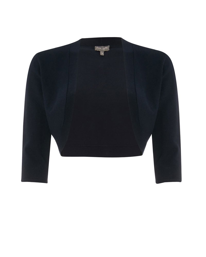 A cropped knit bolero, ideal for layering over a dress. With an open front, shawl collar and 3/4 length sleeves.