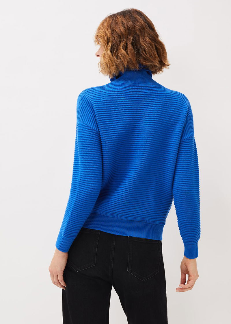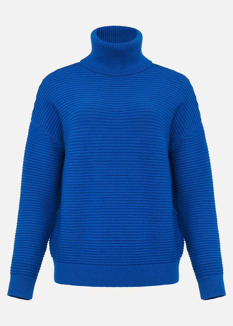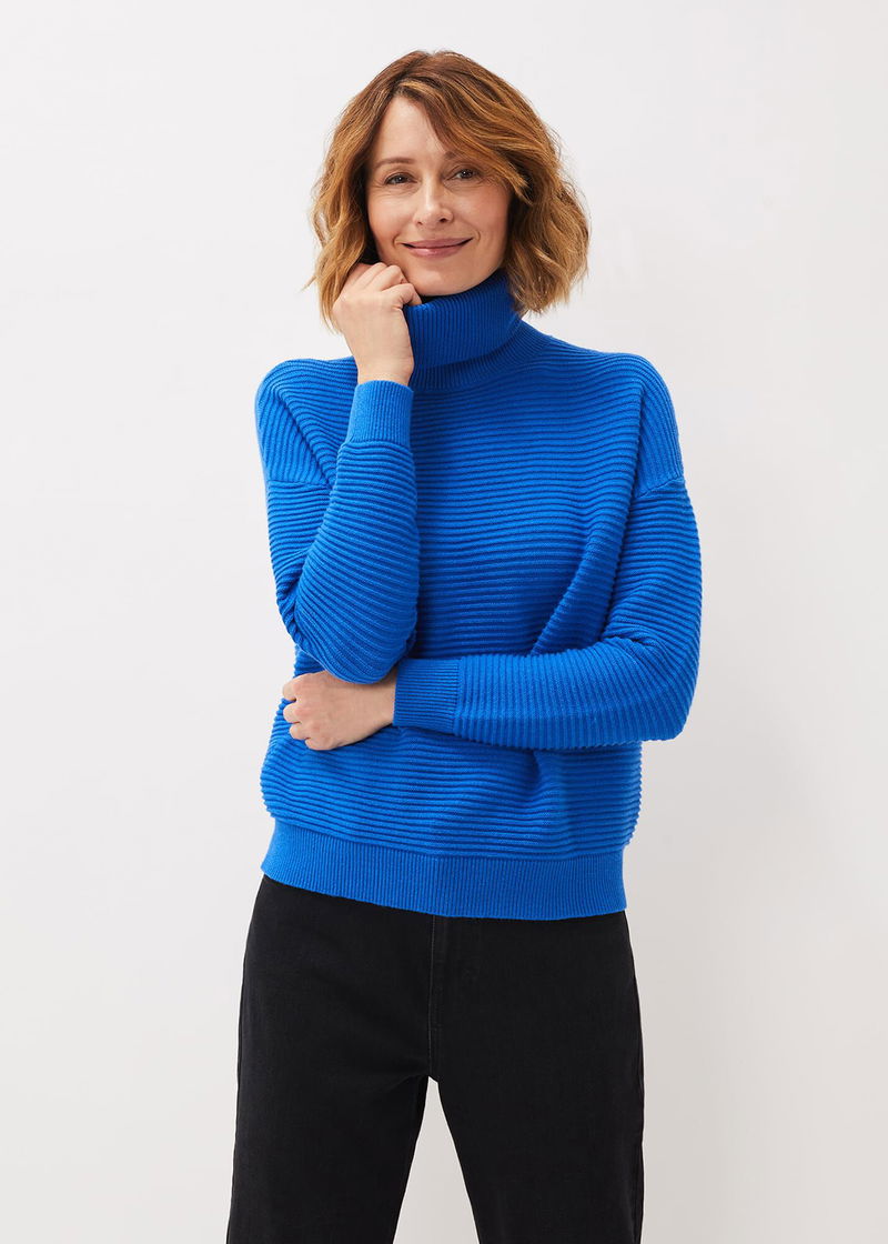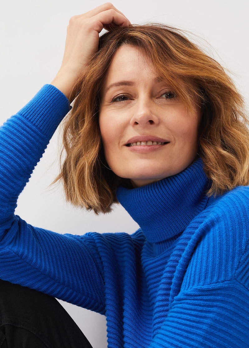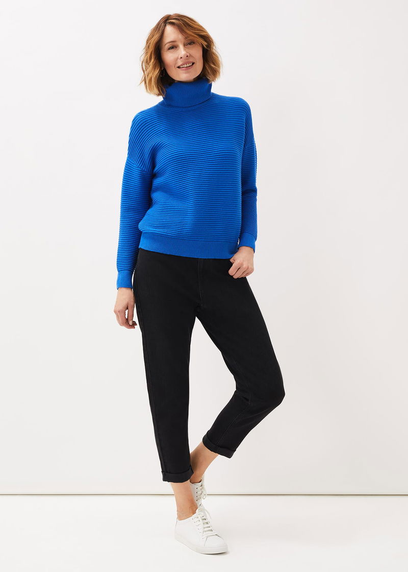 Designed in a modern ribbed texture throughout, this knit jumper make a bright addition to your wardrobe, thanks to its standout blue shade. Featuring a roll neckline, long sleeves and a blouson waist, the brand is pairing theirs with black jeans for an easy, everyday look.