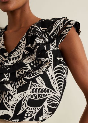Crafted from a linen-rich blend, our Rosey blouse is designed with stunning ruffled detailing throughout, a delicate tie-back detail and a feminine V-neckline. We've styled it with green trousers for a spring-ready look.