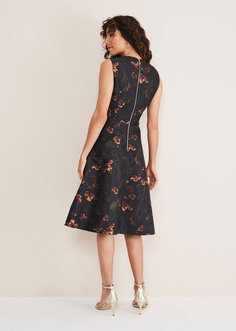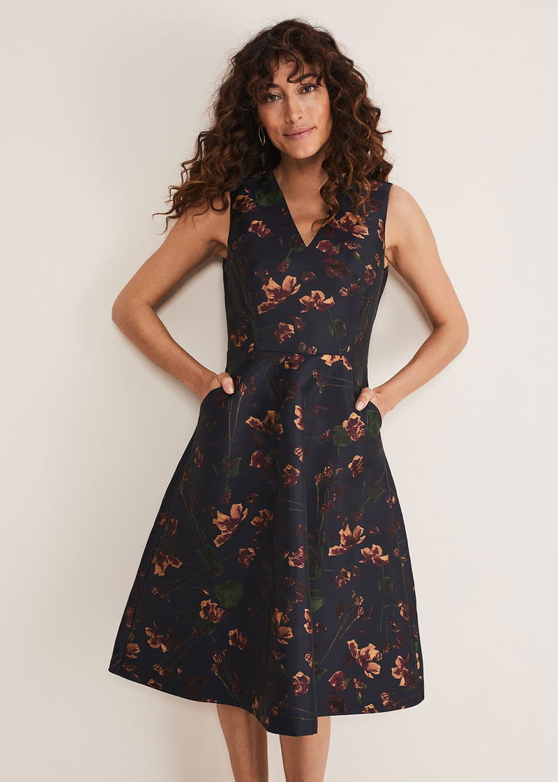 One of our much-loved silhouettes in a brand new design. Our Savannah dress features a fabulous fit and flare silhouette with a feminine V-neck, zip back detailing and is completed with a celebration-ready jacquard shine finish. Its dark floral design is perfectly matched with gold heels for your next special event.