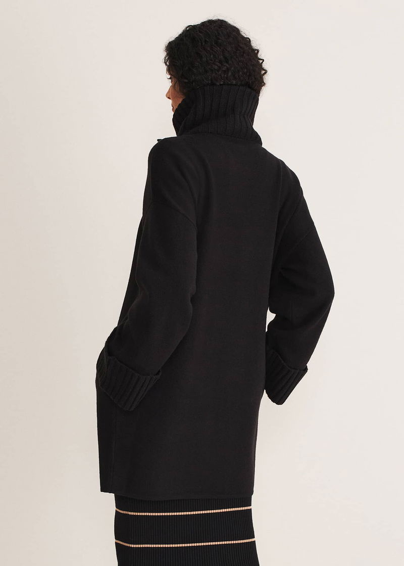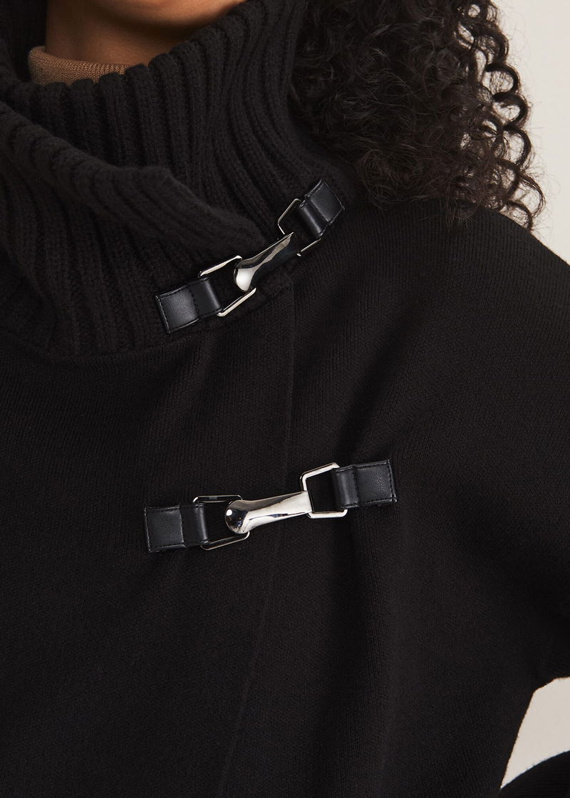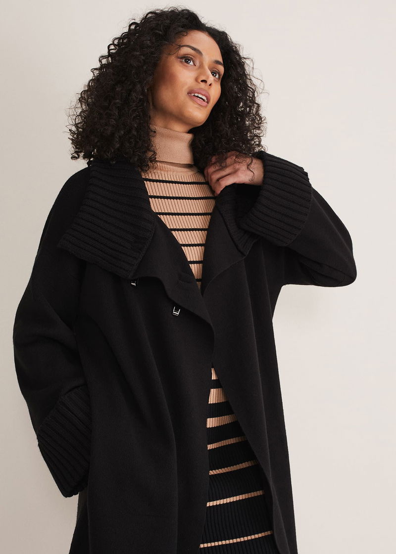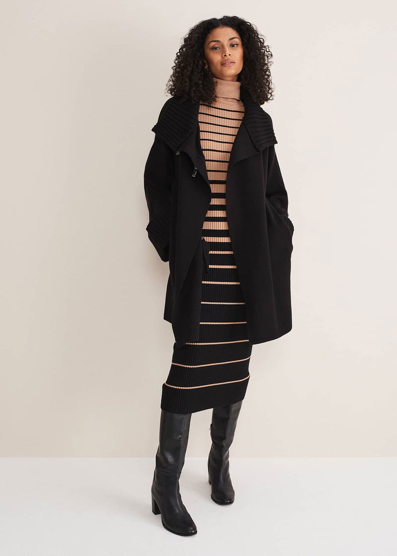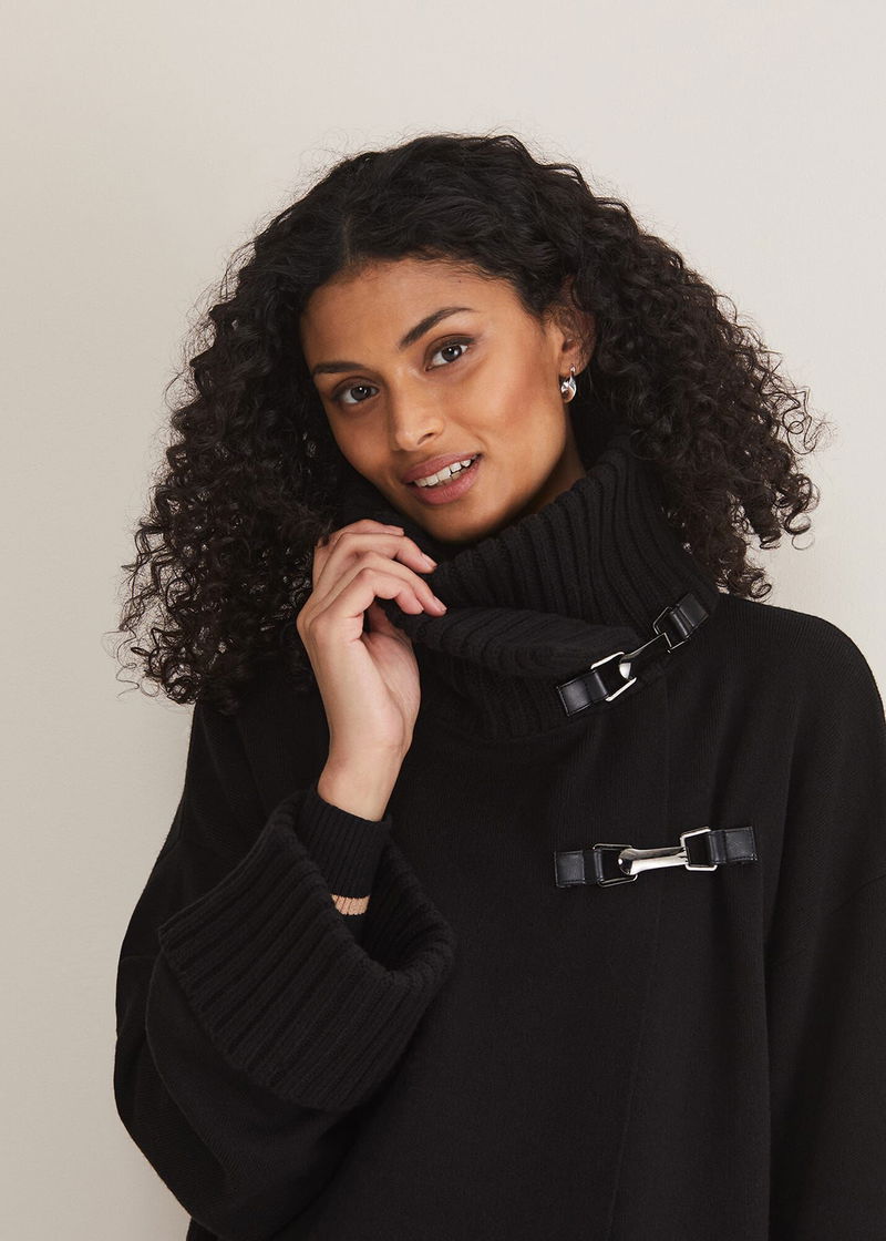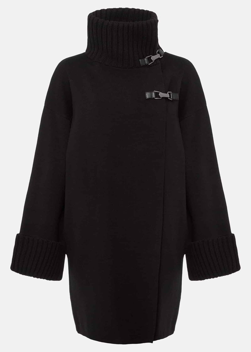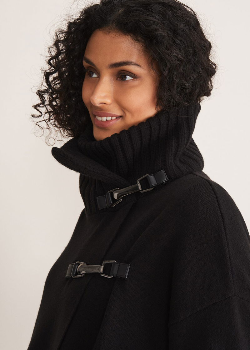 Your new go-to coat. Designed to a cape-style shape with a cosy high neck knit, our versatile black coat features contemprorary buckle detailing for a stylish finish.