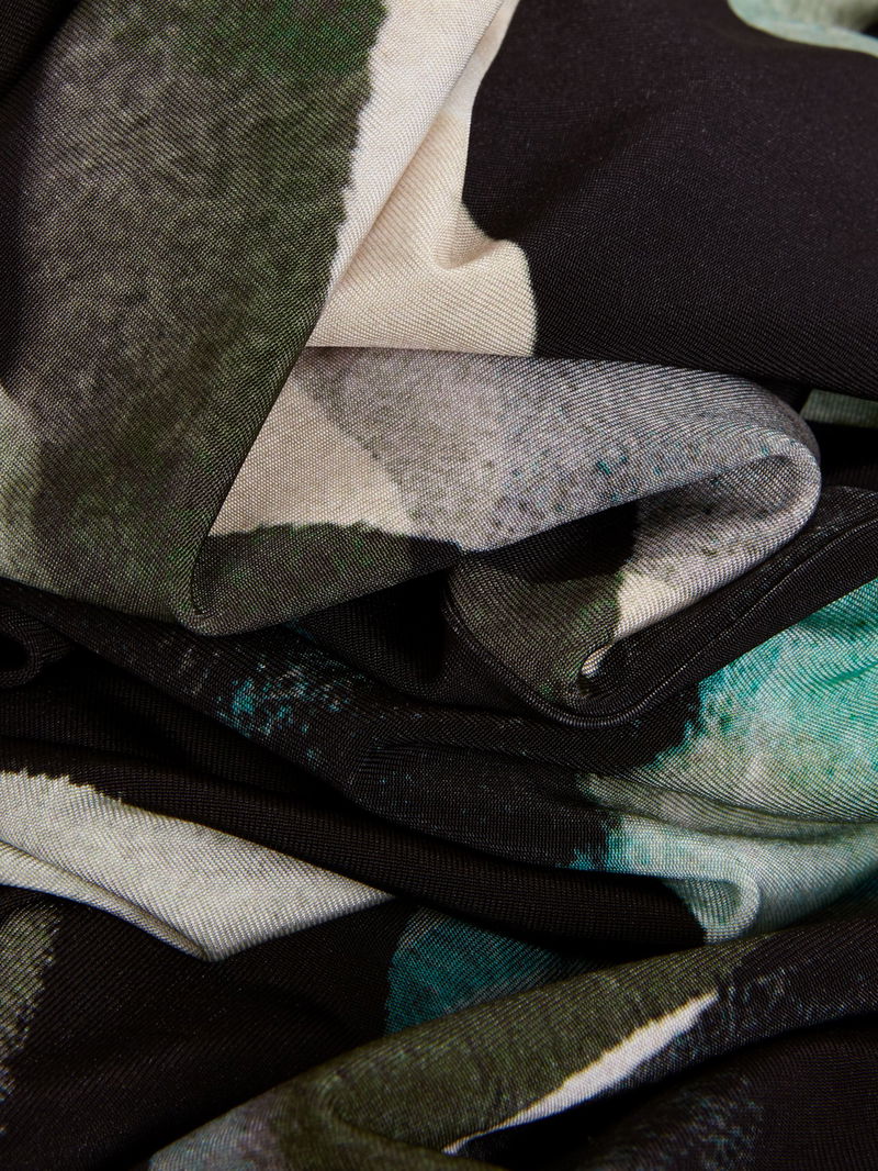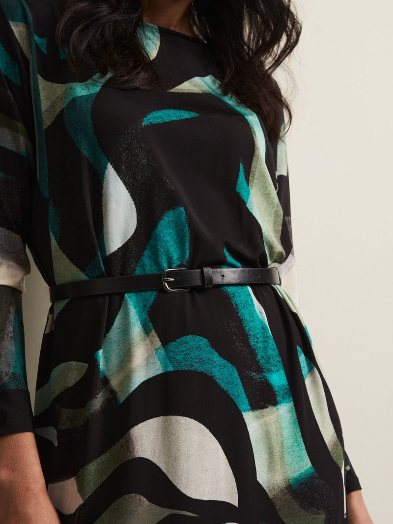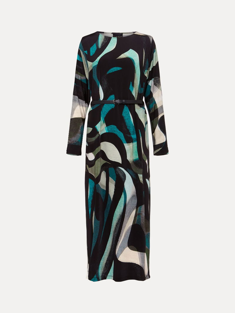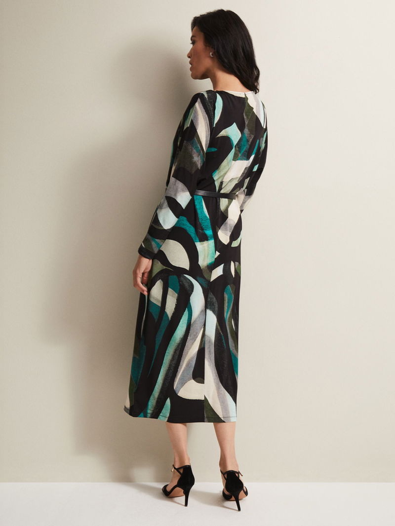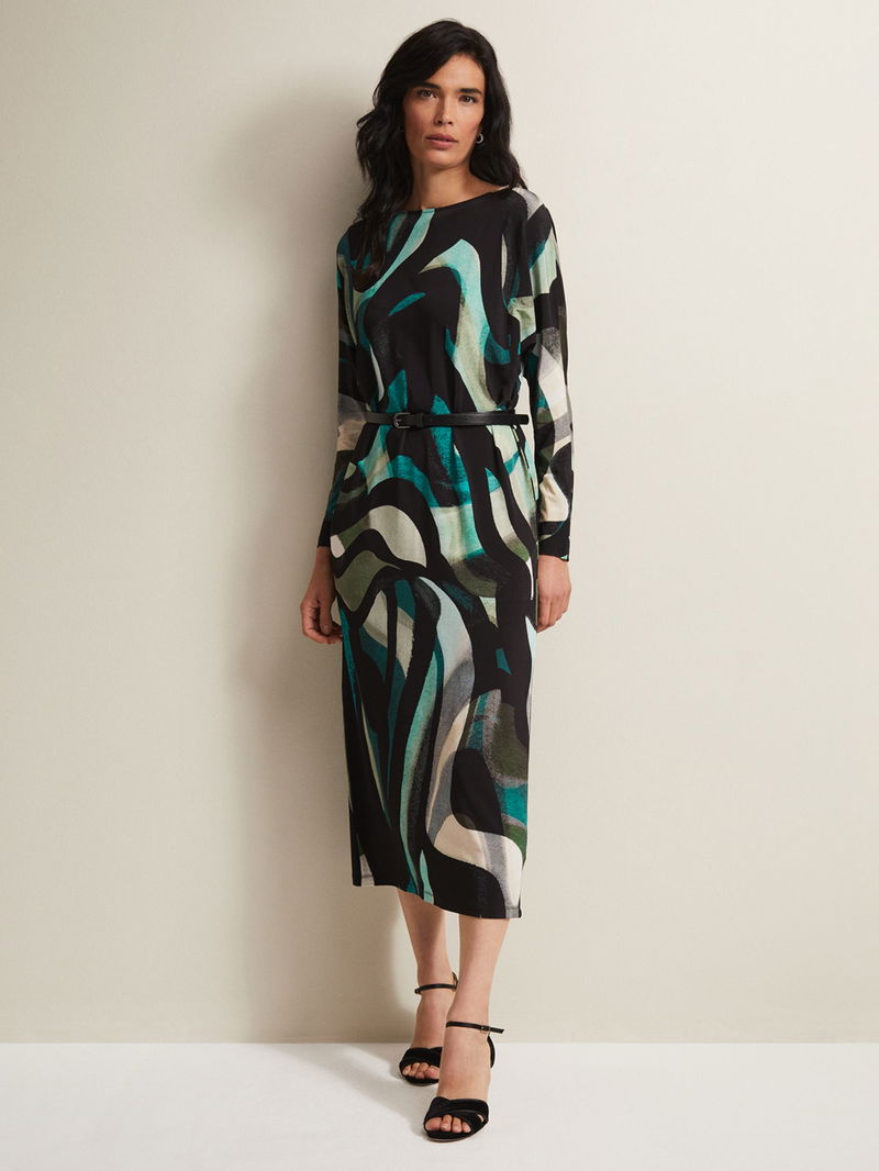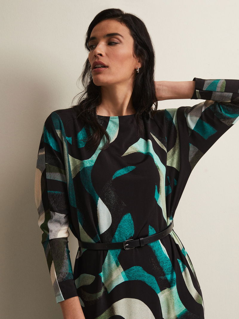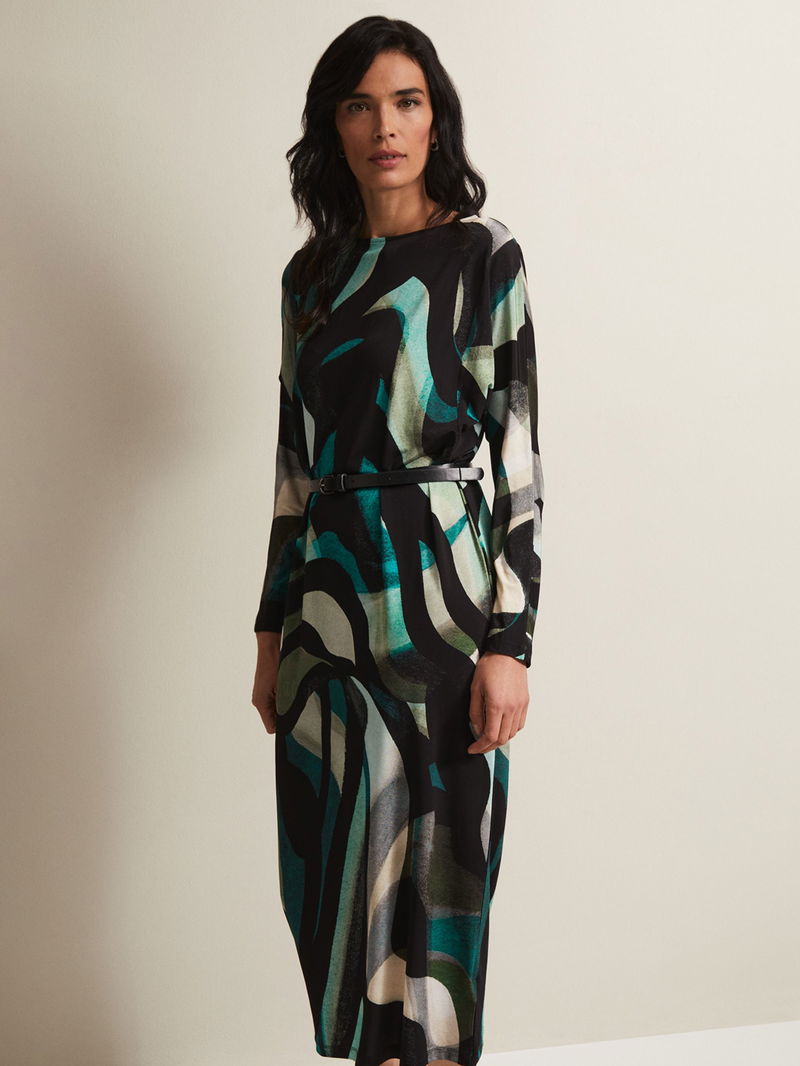 Flowing down the body in a columnar style, this mid-length dress from Phase Eight is made from a whisper-weight viscose blend. Carved with a crew neck and long batwing sleeves, it is dipped in abstracts.