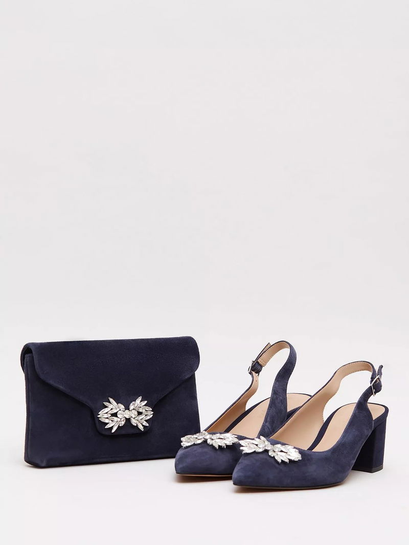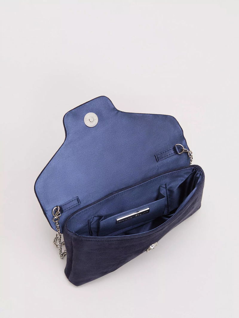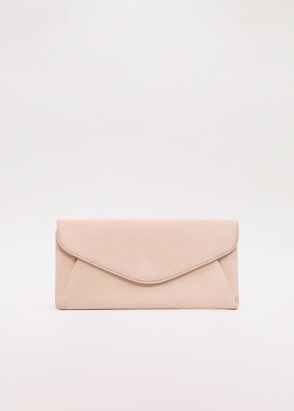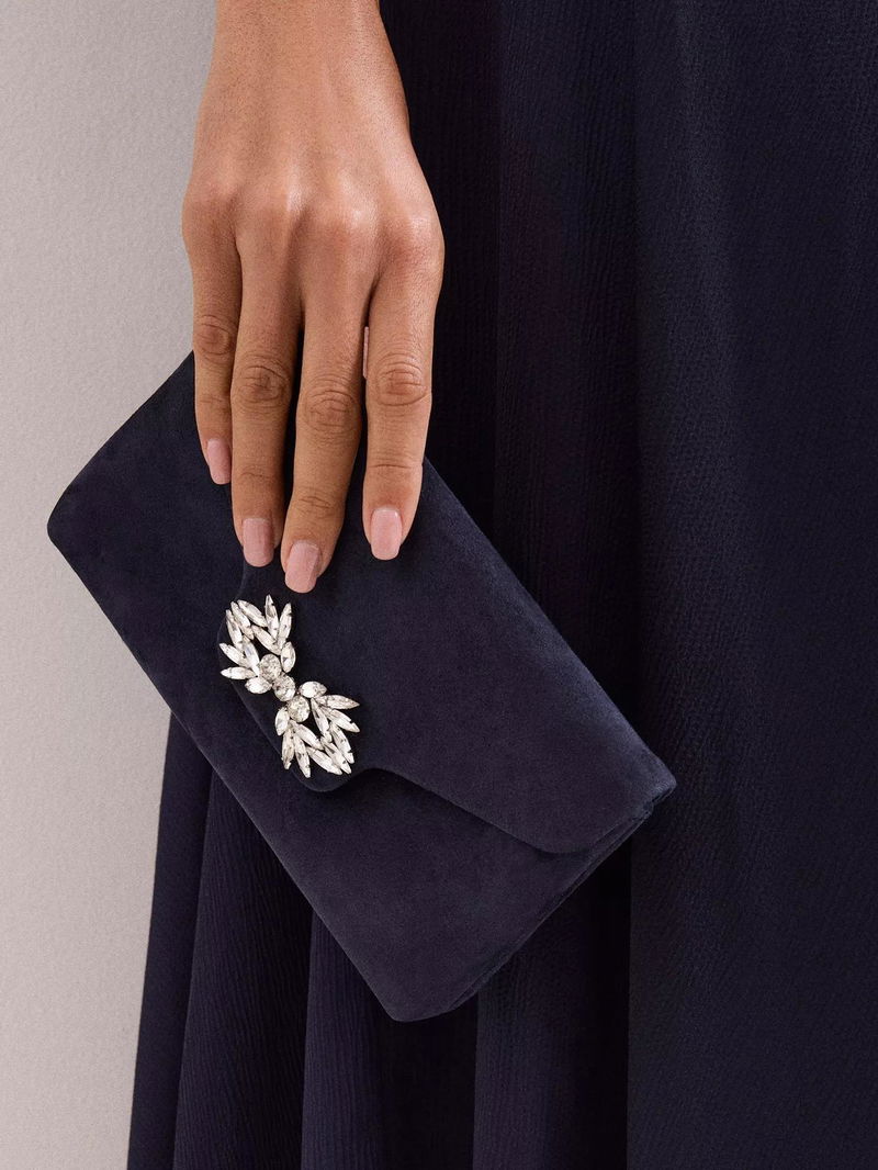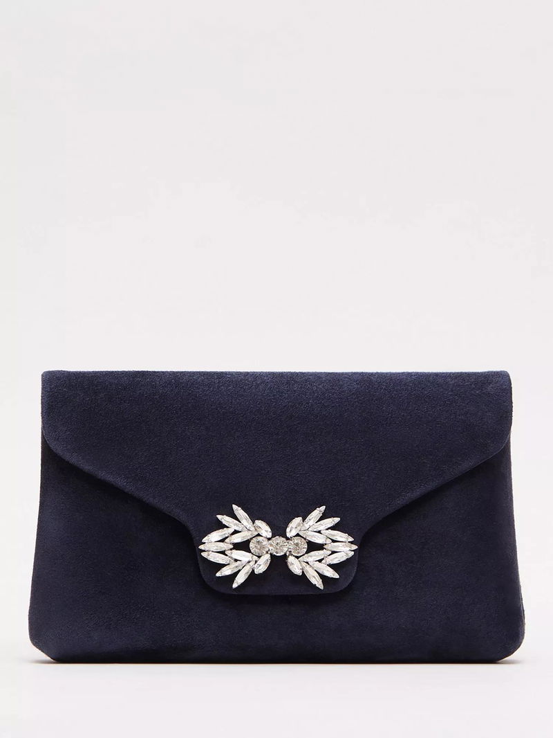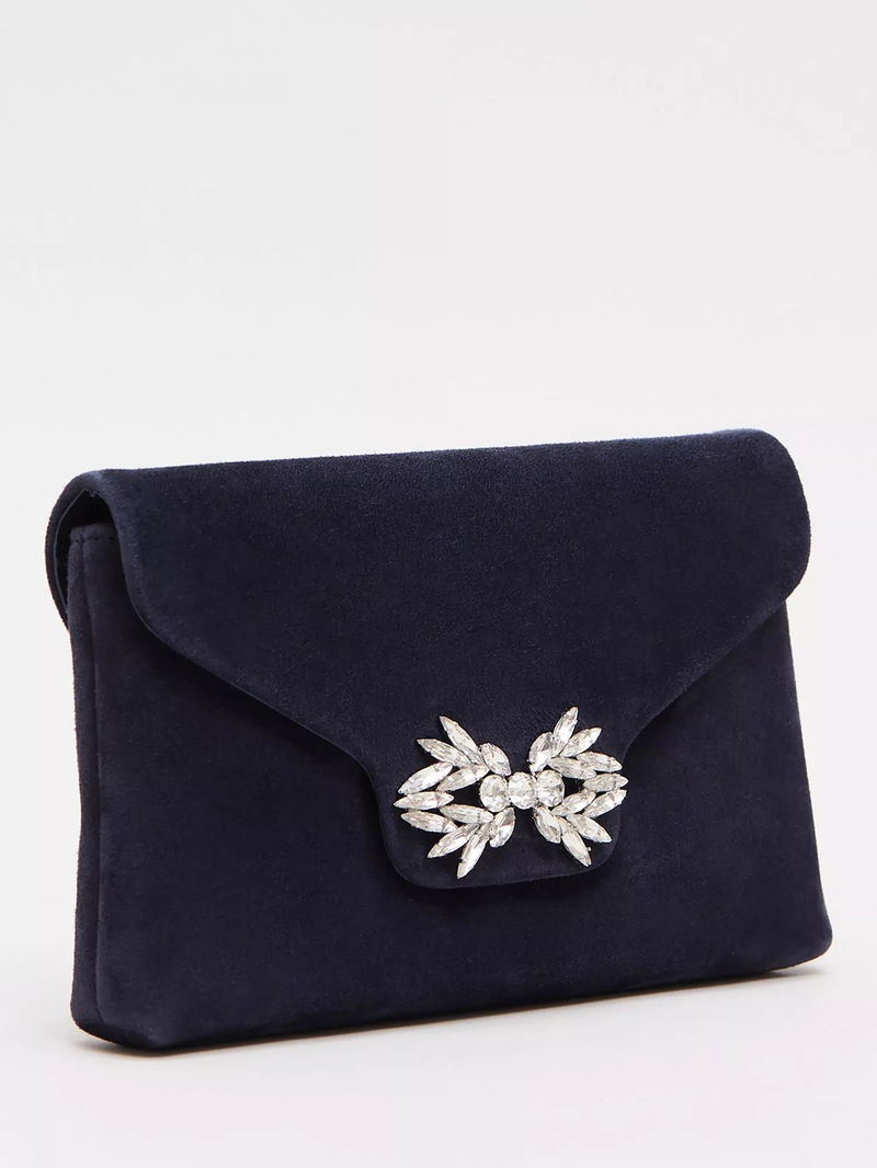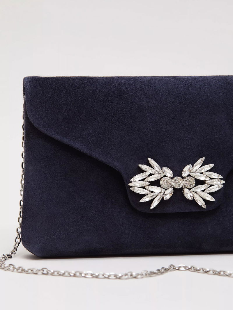 A pure suede foldover clutch bag from Phase Eight, featuring diamante embellishment. With a long chain strap for flexible styling options, the compact design ensures your essentials are kept close.
