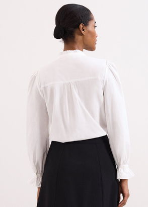 A stunning top to wear to all your special occasions. Designed in a dark pink shade, our Stacey blouse is designed with ruffled detailing and a semi-sheer neckline. We're wearing it with white trousers and matching pink heels.This style is responsibly sourced. This style has been made from recycled polyester, giving materials that would have ended up in landfill a new lease of life.