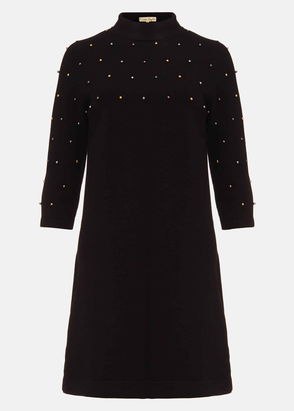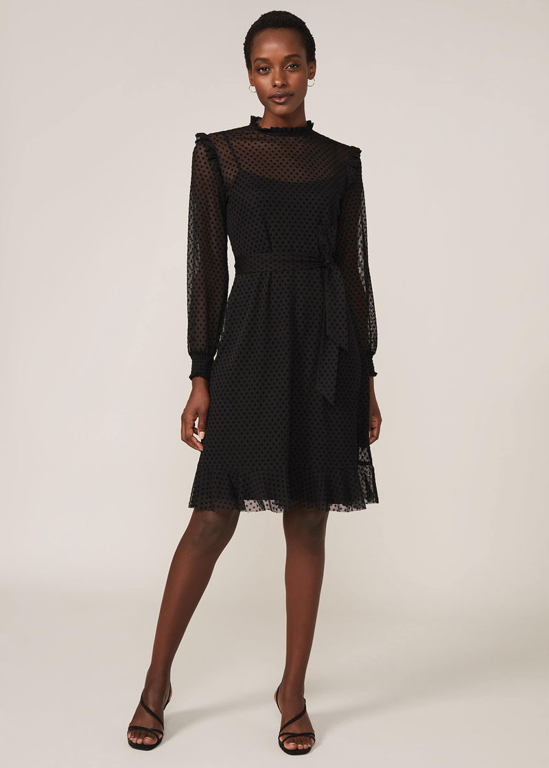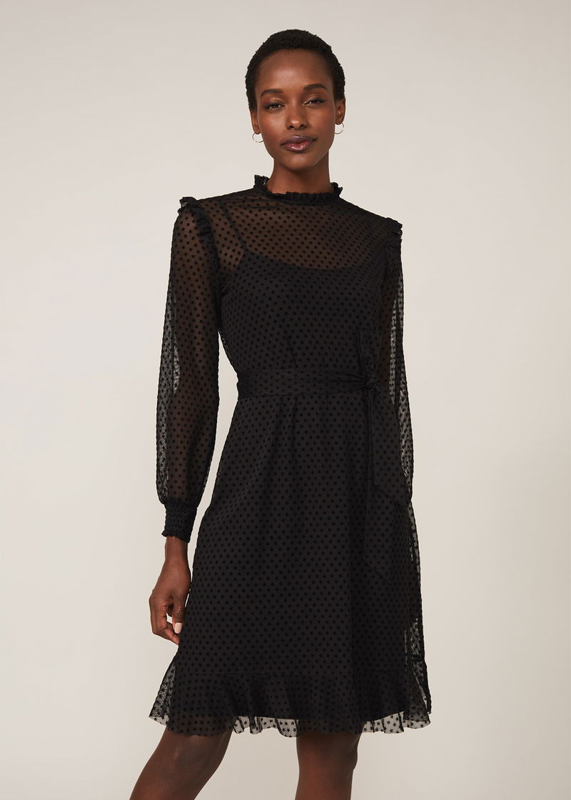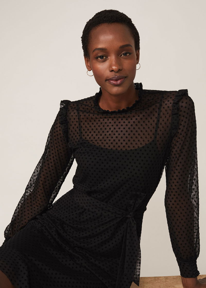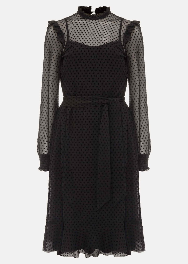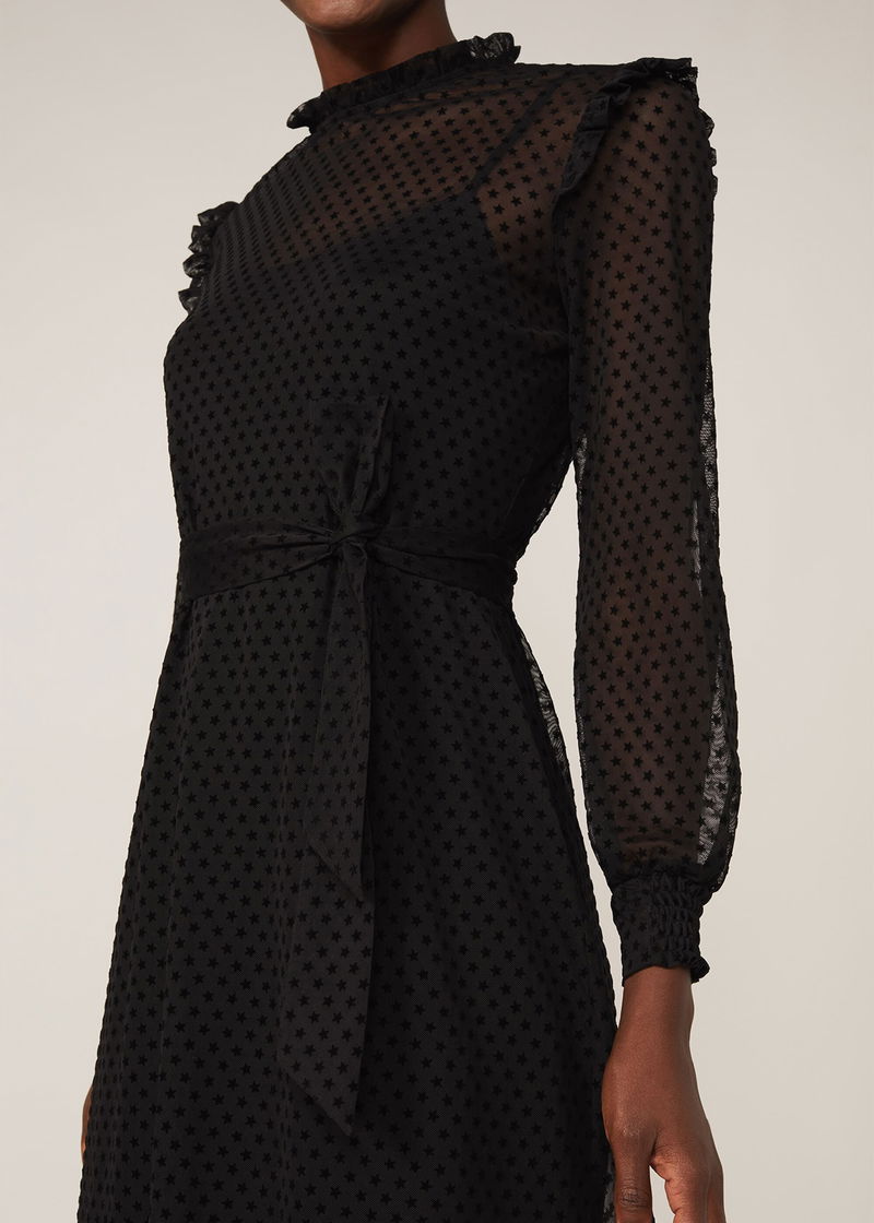 A modern occasion piece, this dress features a star flocked texture throughout. Designed with frill detailing at the neckline and shoulders, this style is finished with semi-sheer sleeves with ruched cuffs, a peplum hem and matching waist tie. Complete this monochrome look with some strappy black sandals.