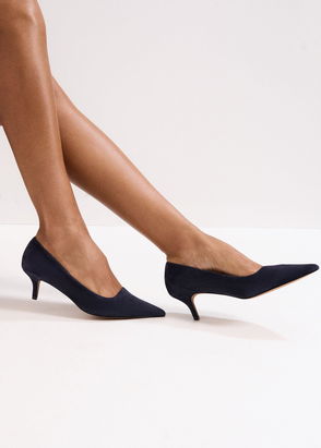 The perfect finish to your event outfit. These elegant suede navy heels feature bow detailing at the pointed toe. Simply style with their matching clutch.