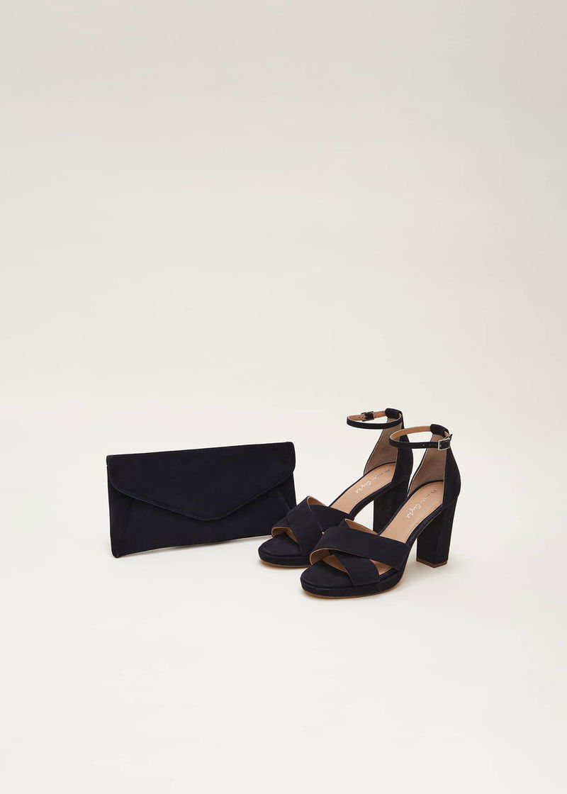 Elevate your look with these platform heels. The navy suede heels are designed with a cross over detail across the open toe and a buckle fastening at the ankle. Wear with the matching clutch bag for an event-ready look.