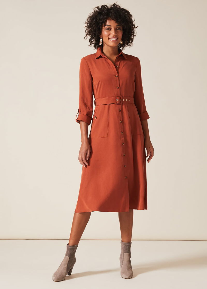 A statement shirt dress is an essential. This on-trend midi length style is detailed with a tortoiseshell button front, and finished with a waist-enhancing belt.