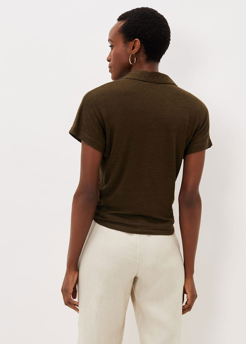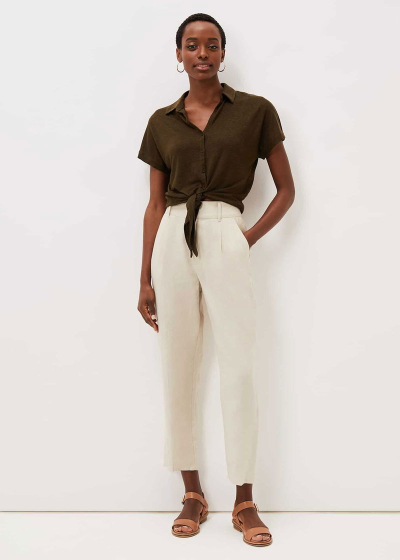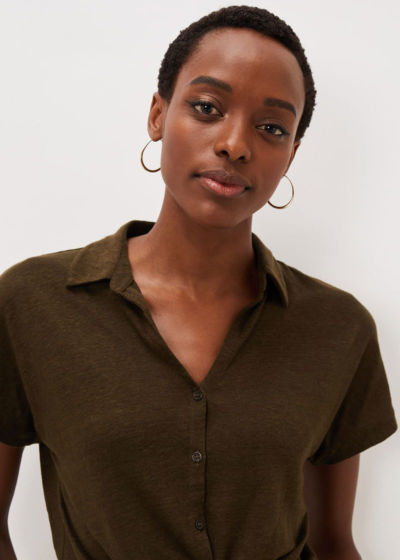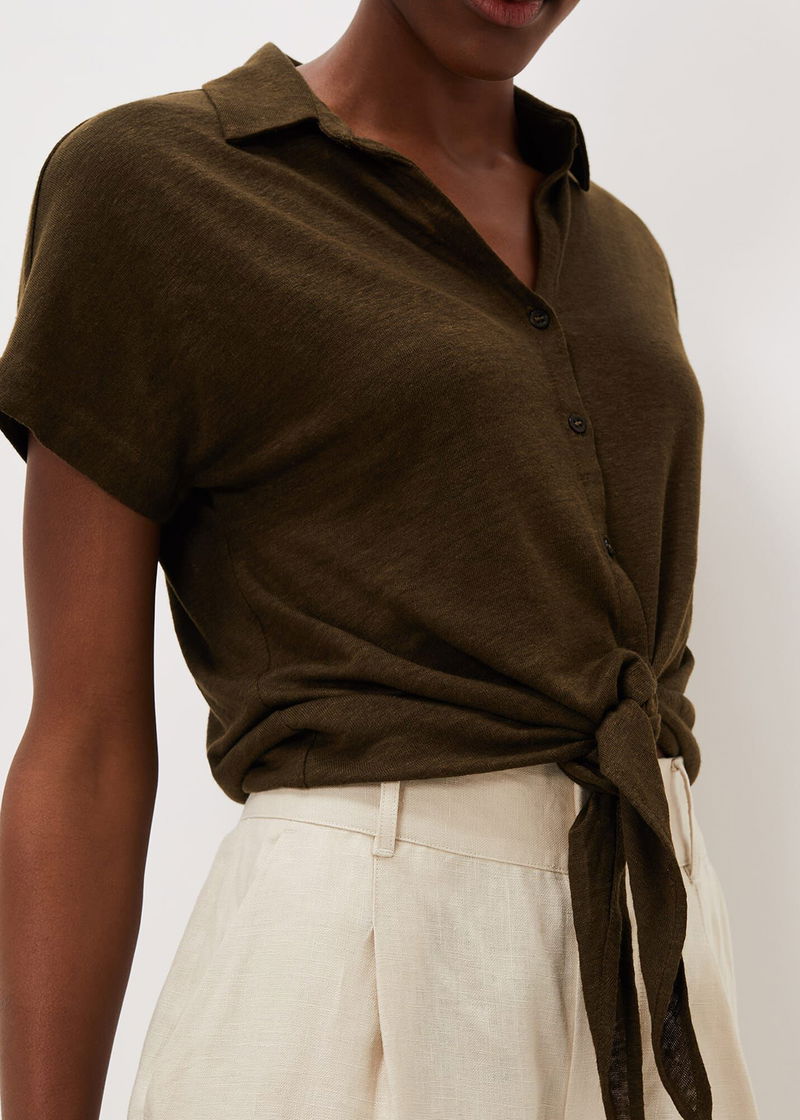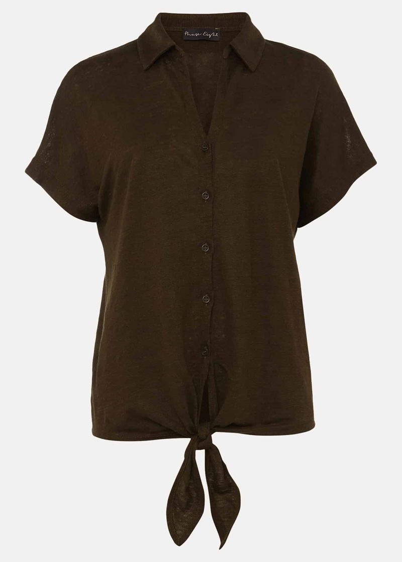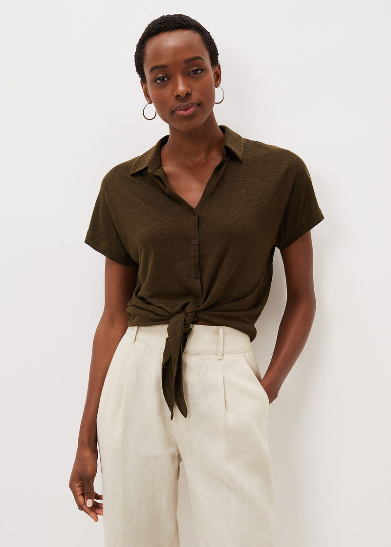 A must-have for your staple wardrobe. Our Tracey shirt is designed in a versatile deep khaki colour and cut from breathable 100% linen - we love the collar and tie front detail. We wear ours with neutral linen trousers and sandals for a casual, everyday look.