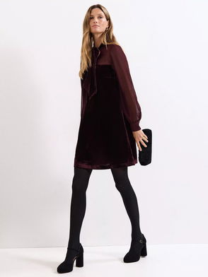 The classic black mini dress your wardrobe needs. Designed with long blouson sleeves and a sheer yoke, our Seraphine dress is cut to a tunic style silhouette. The luxe velvet material and scarf detailing at the V-neckline creates a timeless feminine style.