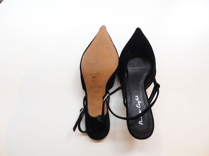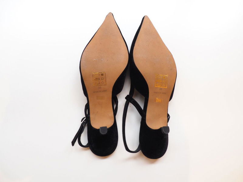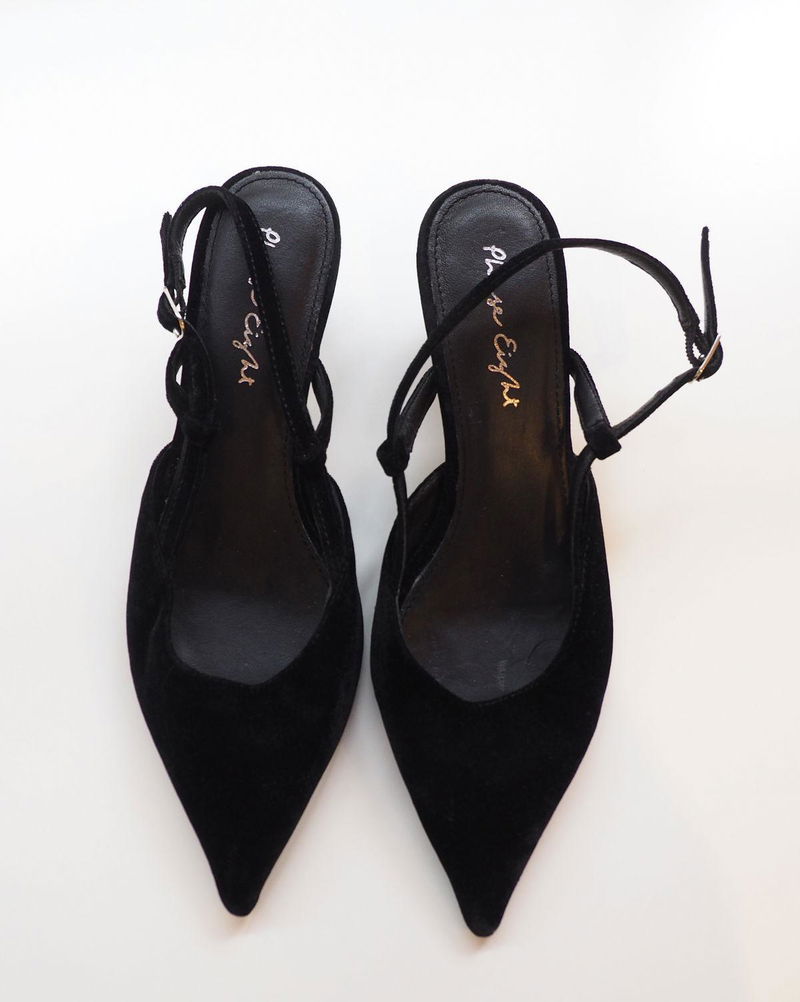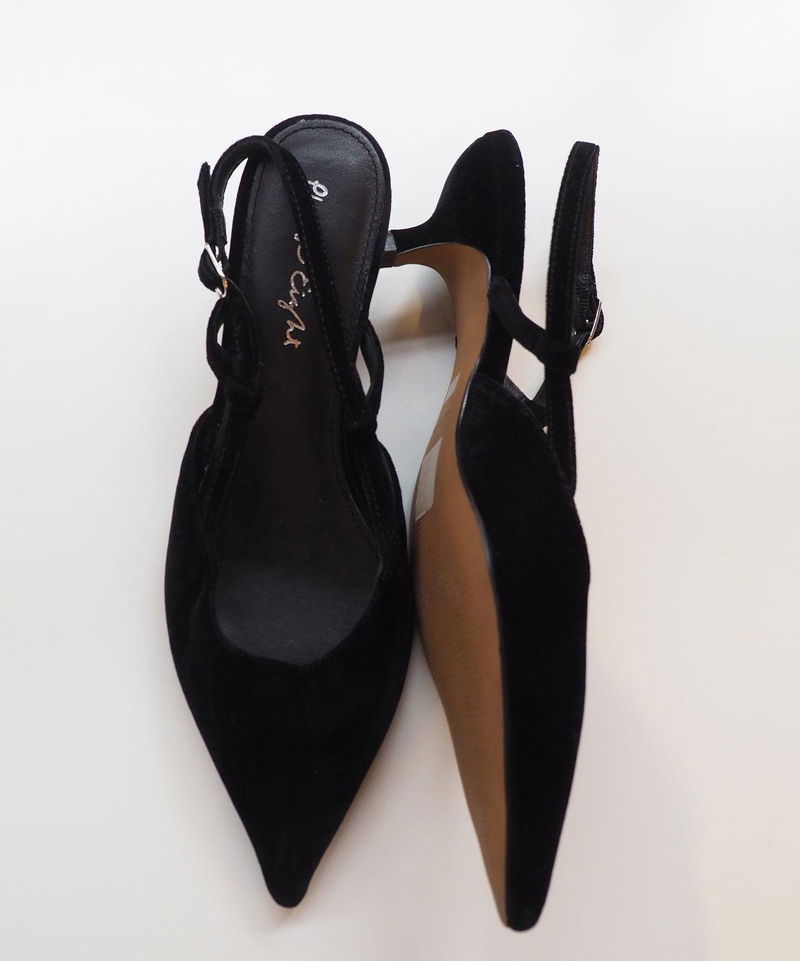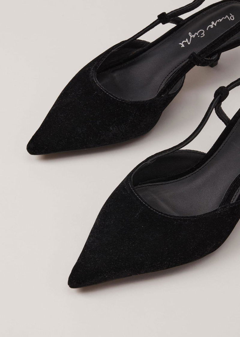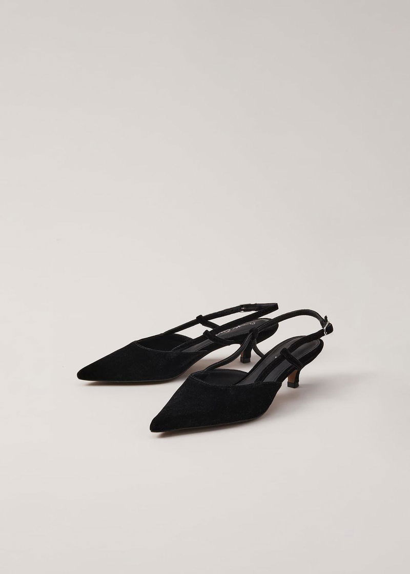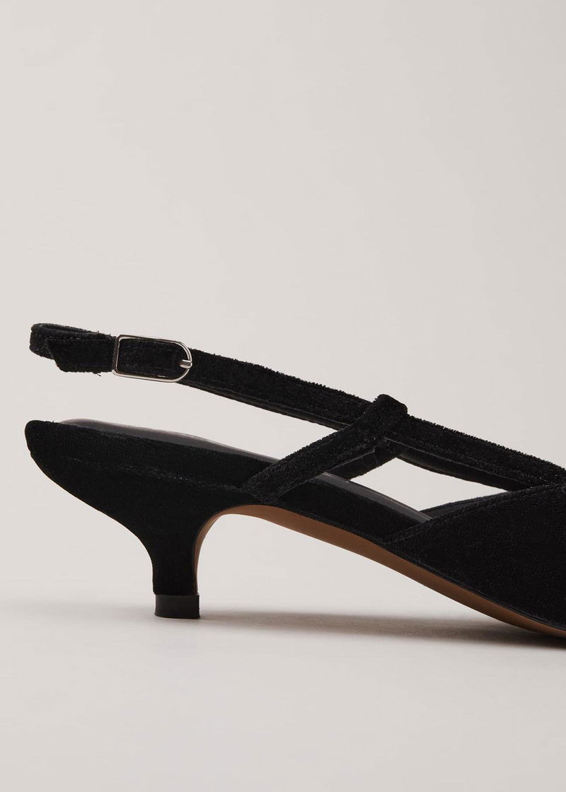 These velvet slingback kitten heels are designed with a pointed closed toe, a small heel and a silver buckle at the ankle. They're the perfect shoes to wear with a dress to work or an event outfit at the weekend.