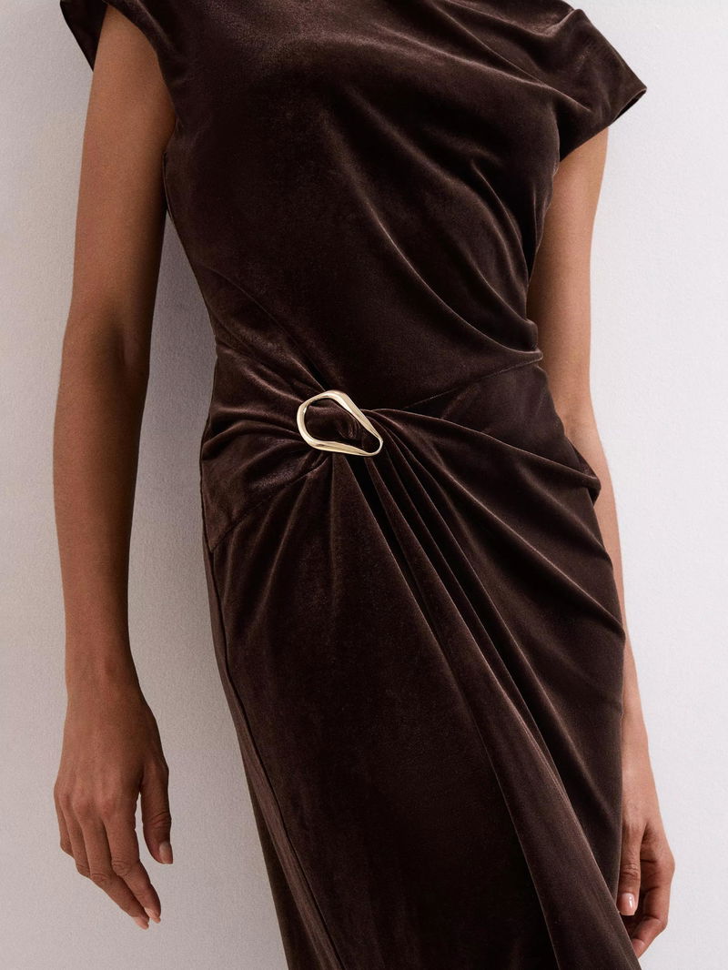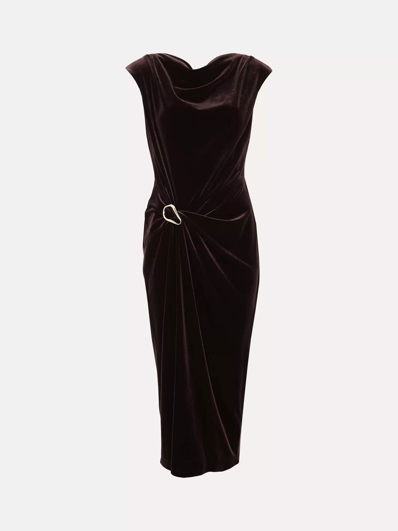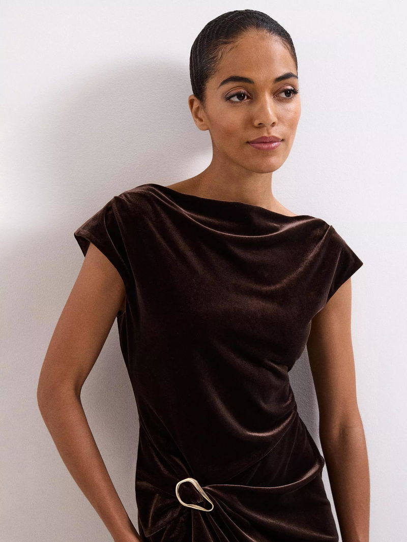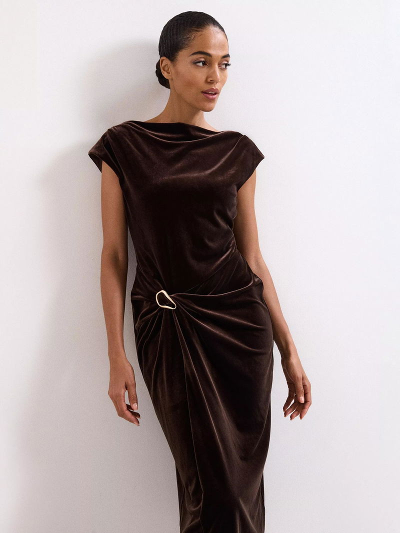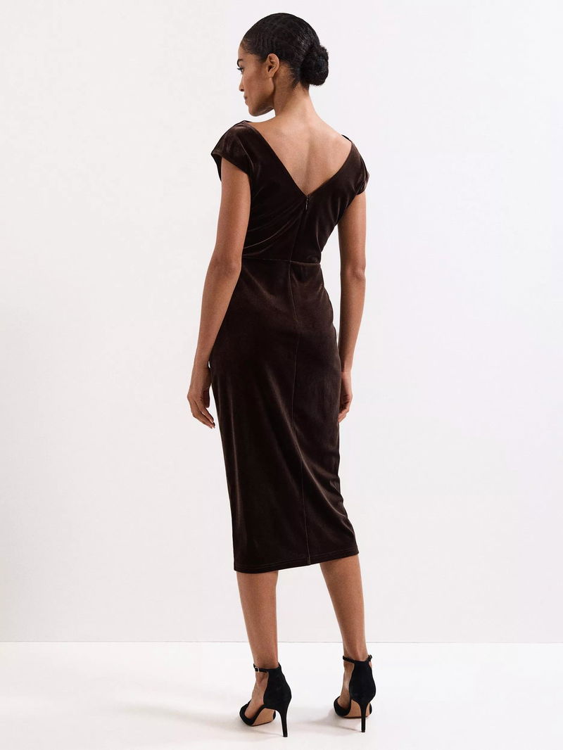 This cap sleeved midi dress by Phase Eight is characterised by a boat neckline and boasts a pencil silhouette that gathers at the front.