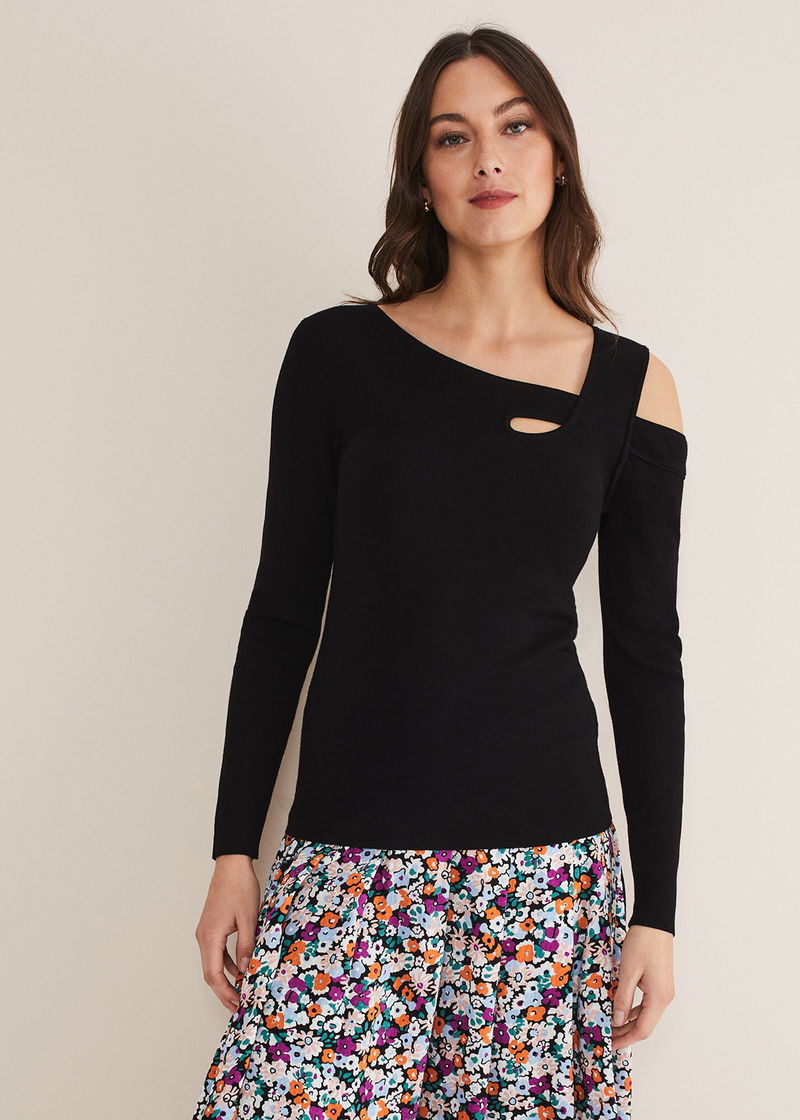 A wardrobe staple with a glamorous twist. Our long-sleeved, slim fit knit is designed with contemporary cut outs to the front and shoulder. We wear ours with patterned culottes and black heels for a stylish outfit.This style is responsibly sourced.