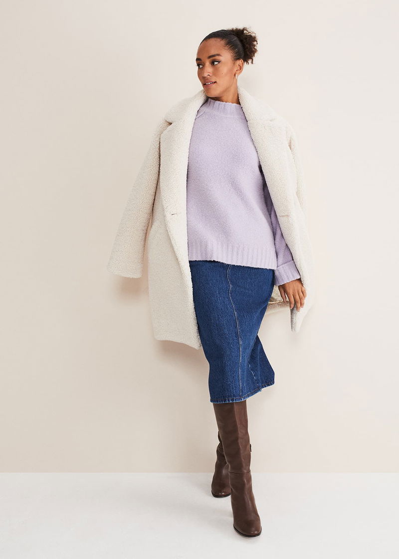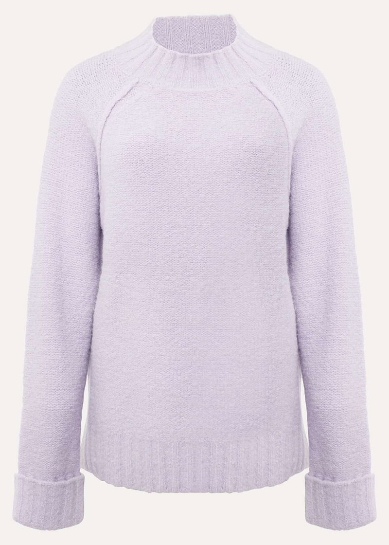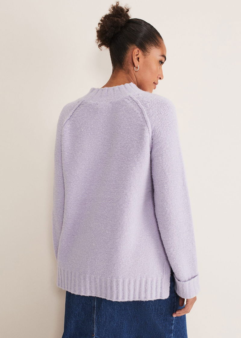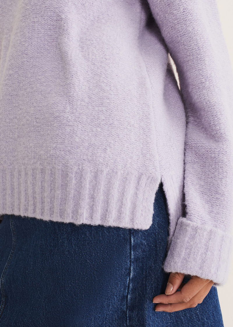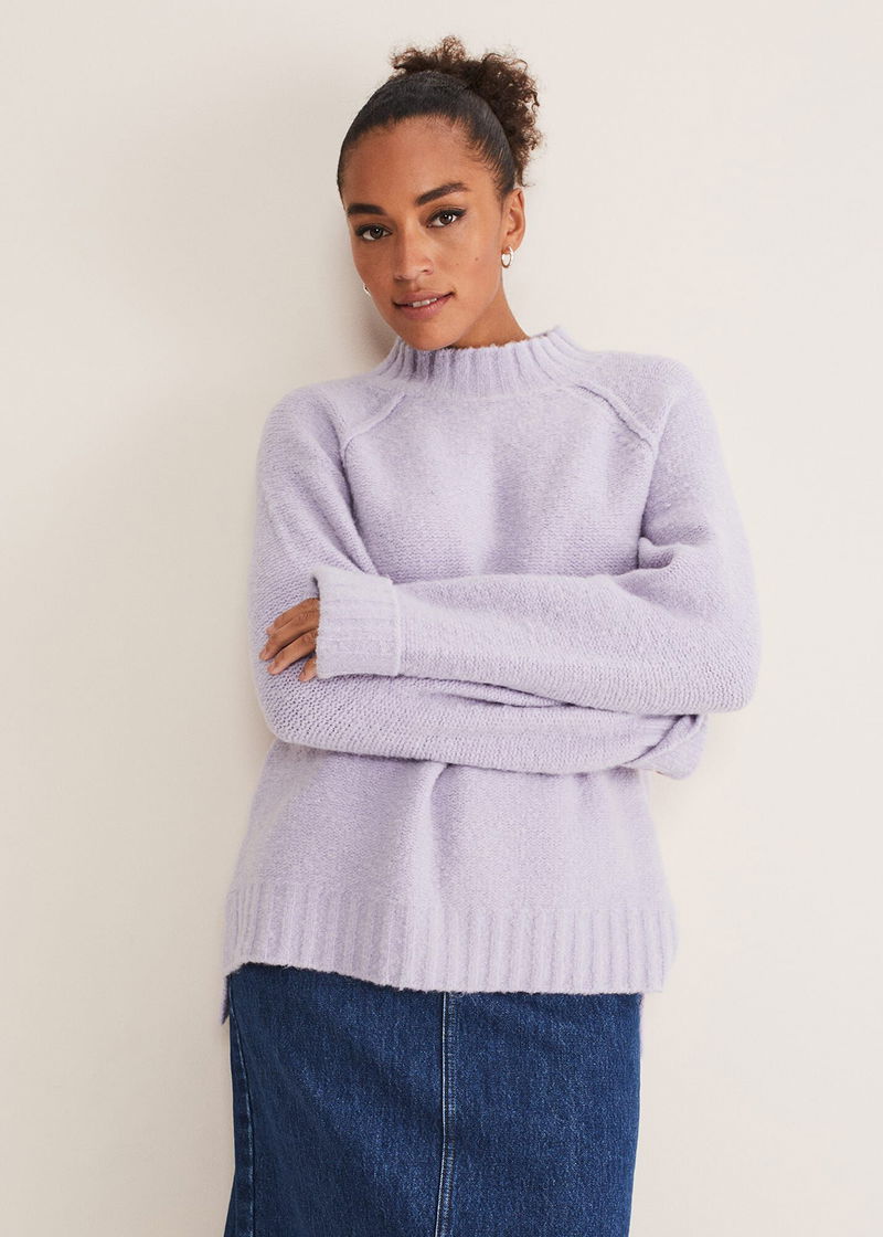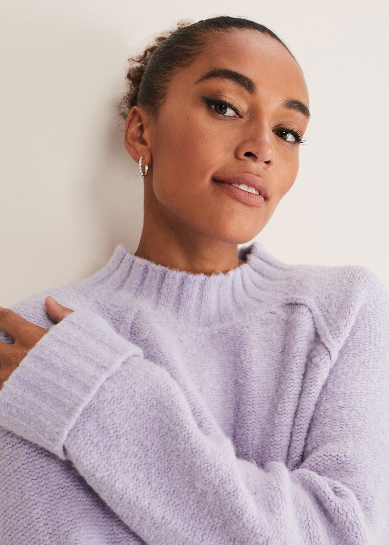 The jumper to add to your wardrobe this autumn/winter. Crafted from a super-soft wool blend and designed in a trending pale purple shade, our jumper features a chunky funnel neck and hem, cuff and neck stitch detailing. We wear ours with a denim skirt and boots for a stylish weekend look.