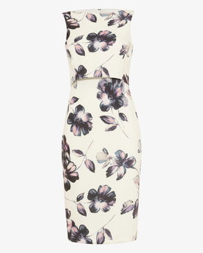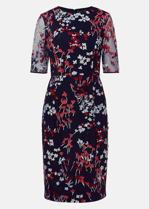 A double layered occasion dress in a floral and butterfly print. This fitted shift shape is fully lined, and fastens with a concelaed back zip.