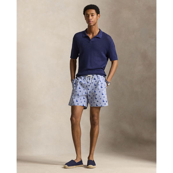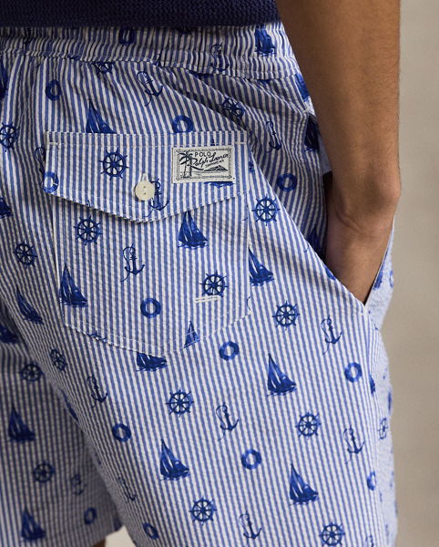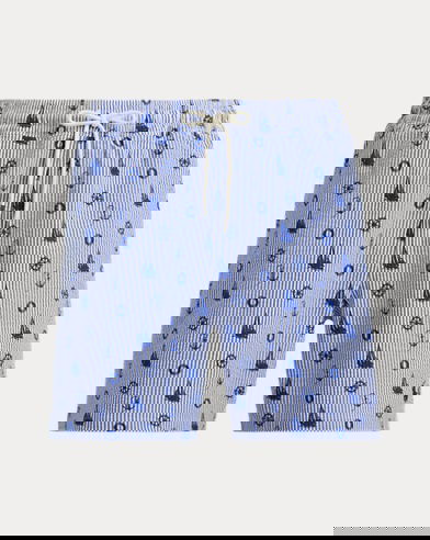 In addition to our signature embroidered Pony, these stretch seersucker swimming trunks feature a classic striped pattern that is overlaid with a nautical-inspired motif.