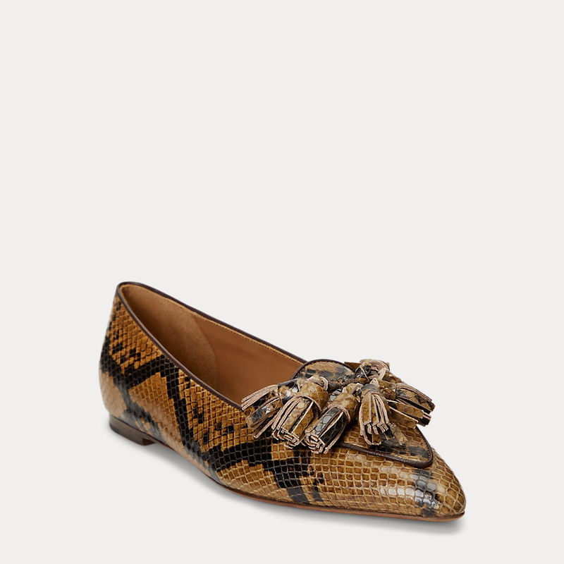 This style draws inspiration from a men's tasselled loafer but is reimagined with a sculpted pointed toe. It's also crafted using an Italian leather upper that's embossed to create a python-inspired motif.