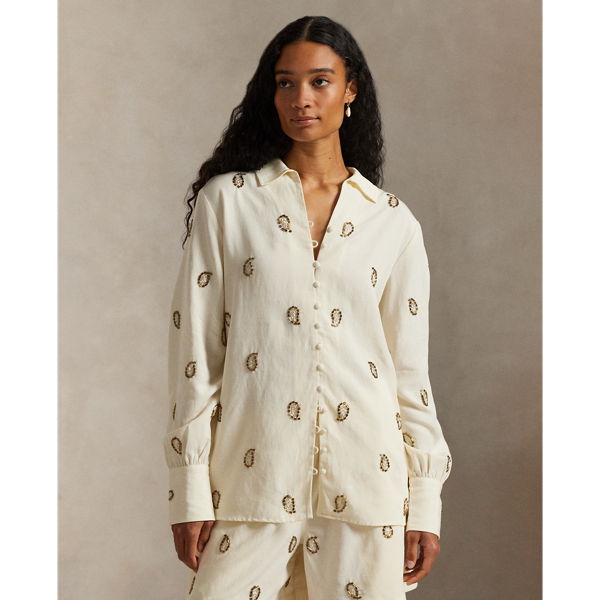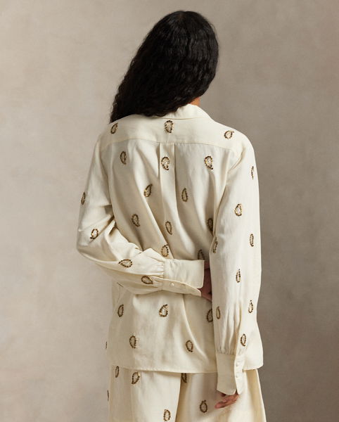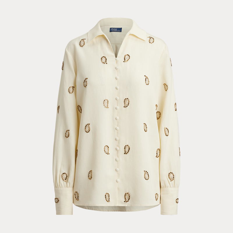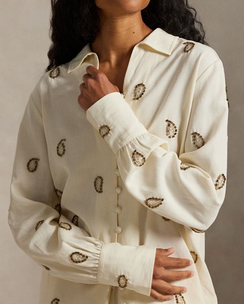 Crafted from beautifully draped fabric, this shirt showcases meticulous paisley beadwork and refined self-covered button closures, capturing a sophisticated and romantic aesthetic.