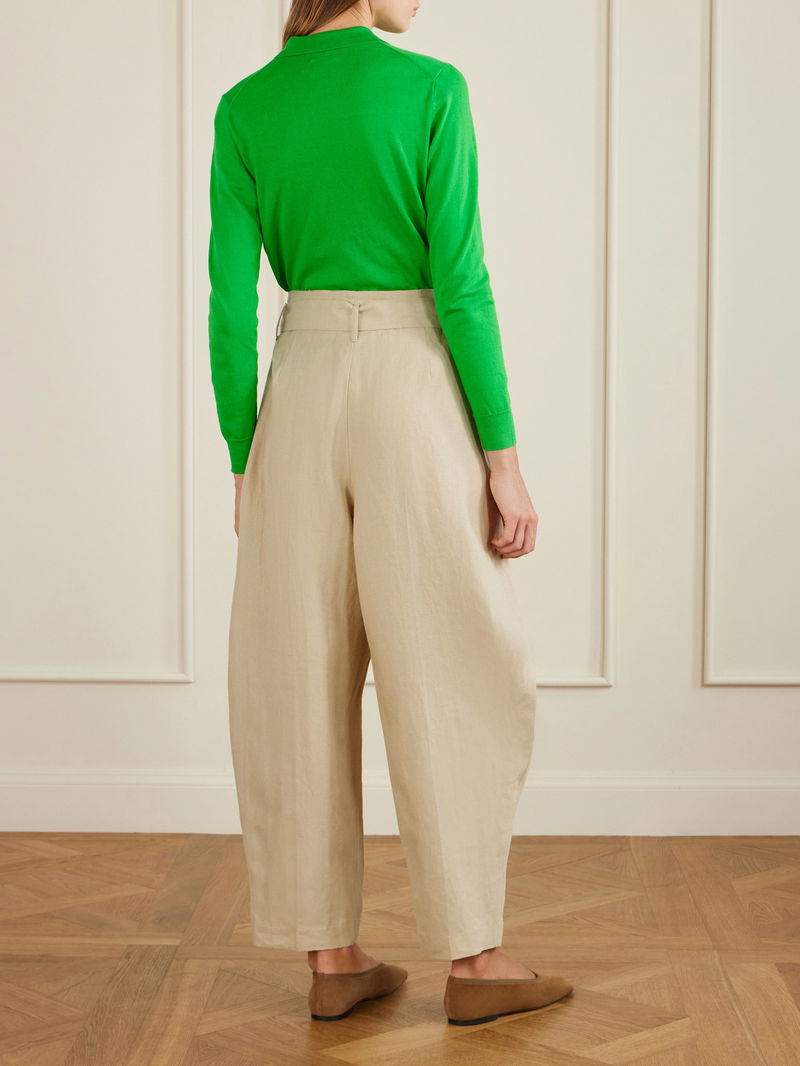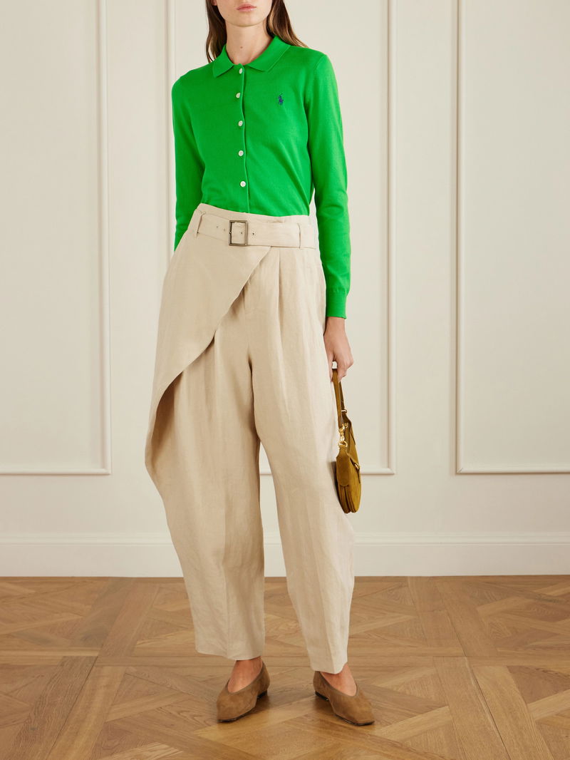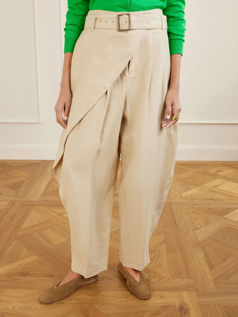Belted Wrap-effect Pleated Linen Tapered Pants