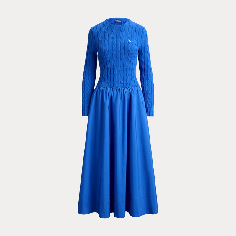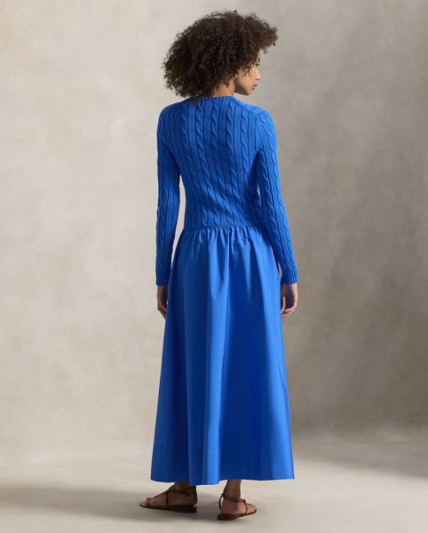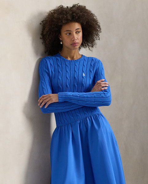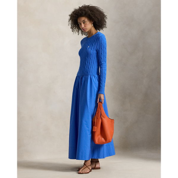 This dress unites the iconic cable-knit construction at the bodice with a flowing, shirred cotton skirt.