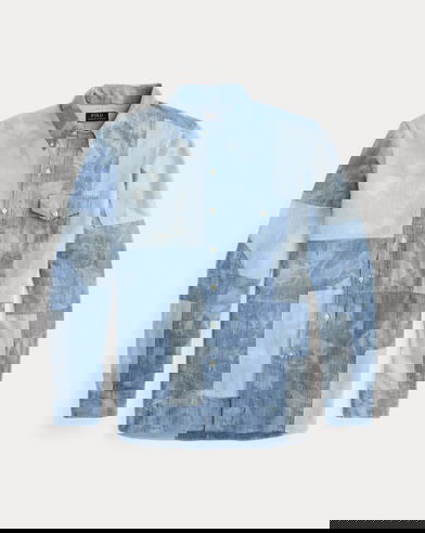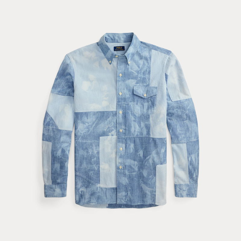 This shirt is crafted from indigo-dyed cotton chambray presented in different washed-out shades.