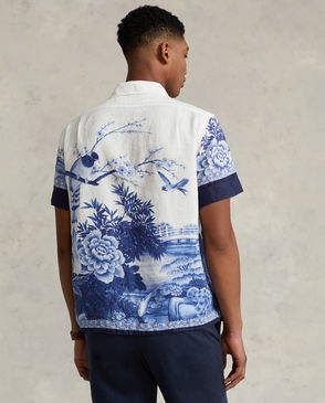This camp shirt is printed with a collage of custom artwork that's based on vintage motorsport posters and the patches used in the season's racing-inspired collection.