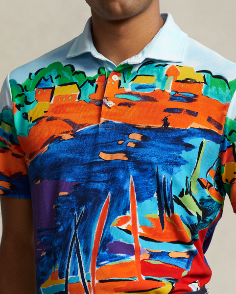 An American style standard since 1972, the Polo shirt has been imitated but never matched. Over the decades, Ralph Lauren Lauren has re-imagined his signature style in a wide array of colours and fits, yet all retain the quality and attention to detail of the iconic original. This trim version is made with a highly breathable cotton mesh, which offers a textured look and a soft feel. It features a painterly sailboat-and-marina print that includes signature-style " Ralph Lauren Lauren" text at the front.