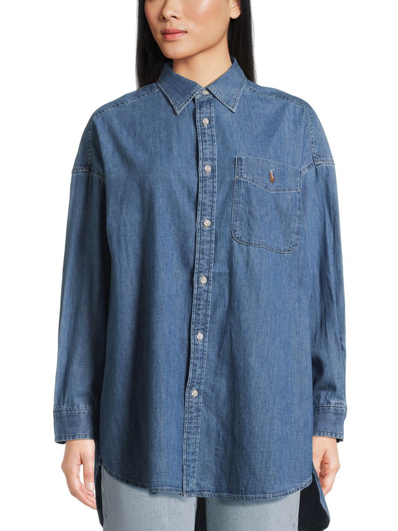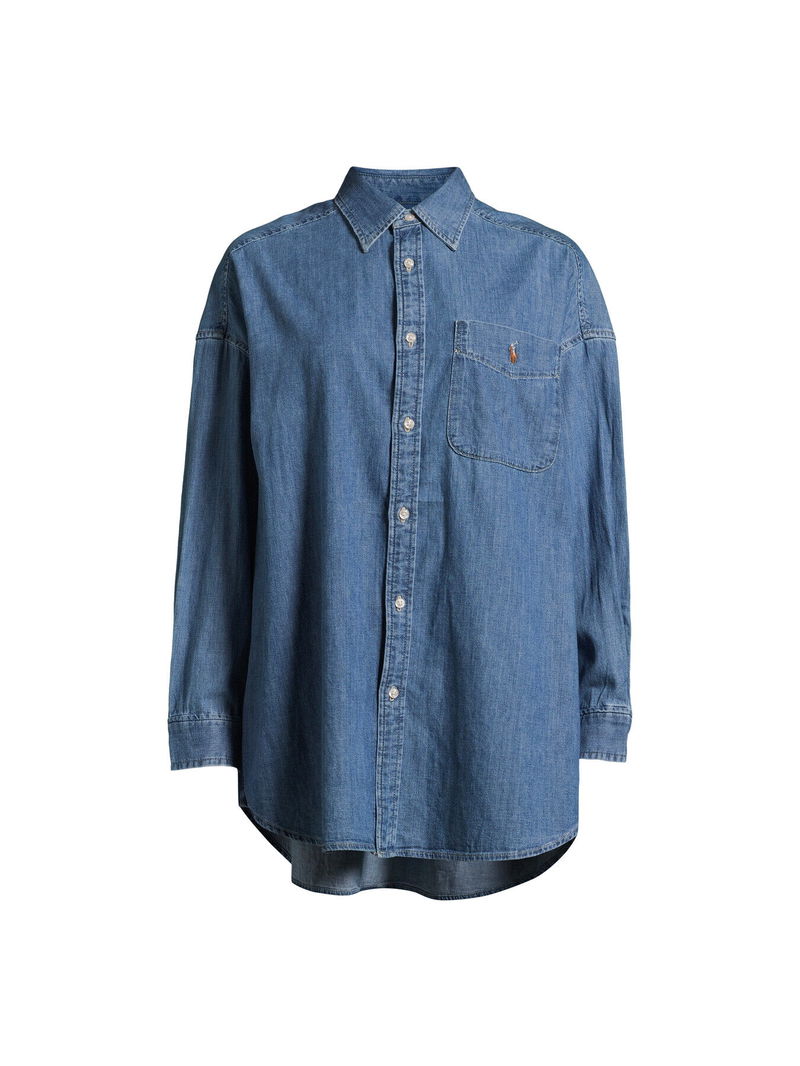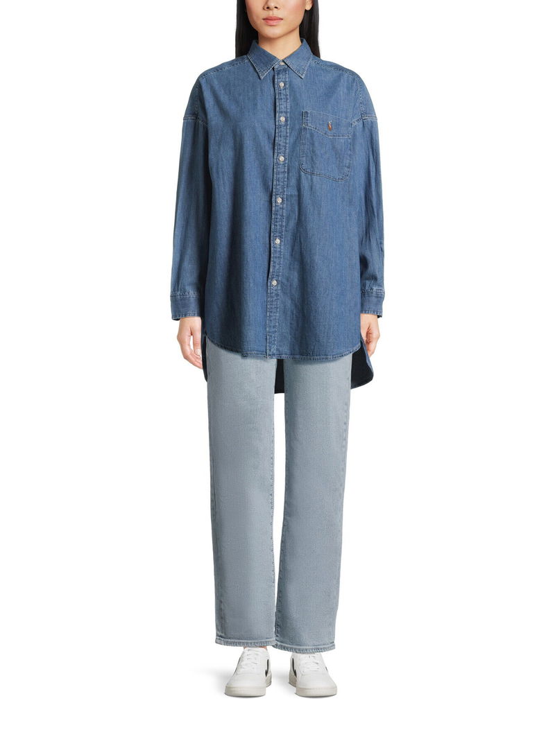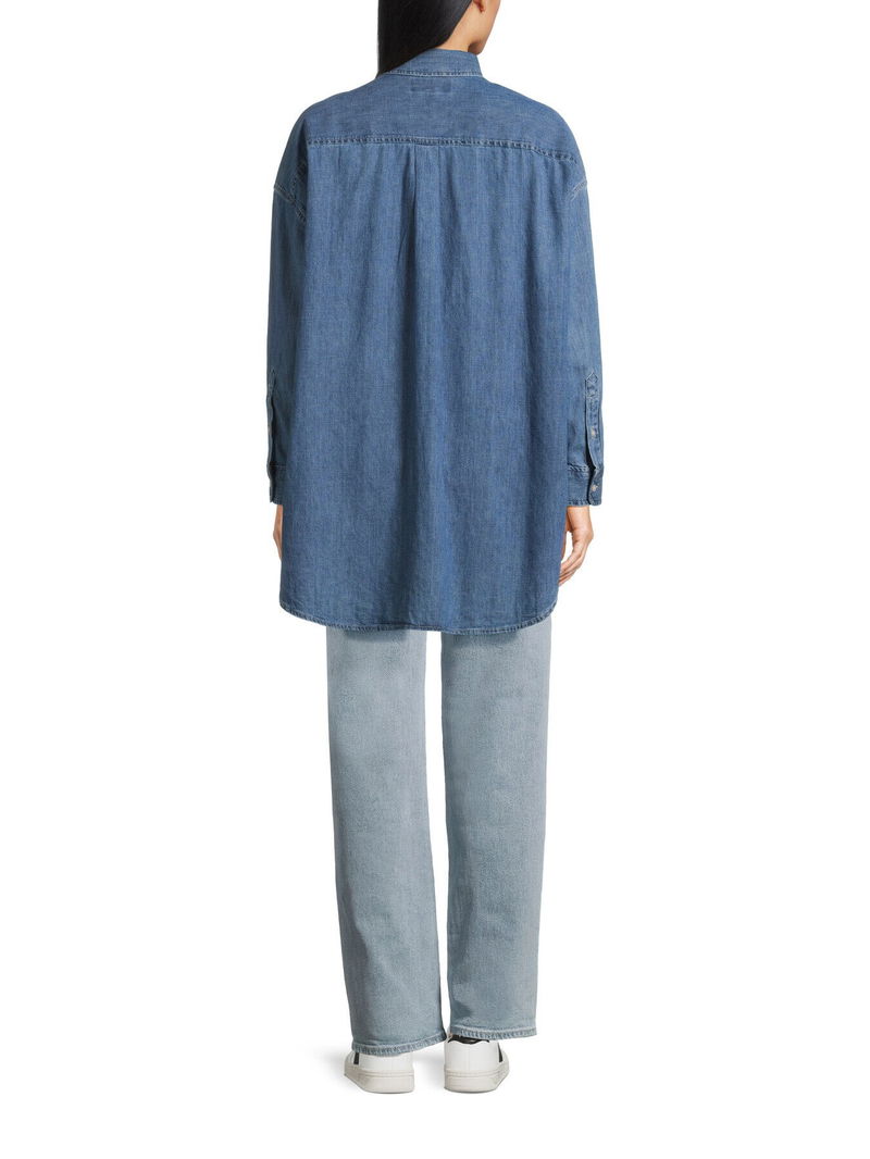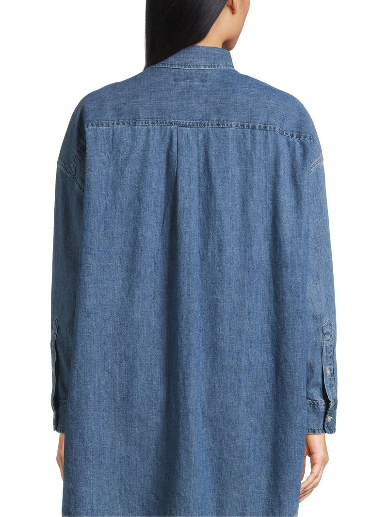 Made with Japanese cotton twill, this lightweight shirt is cut in a long, oversize fit. Its medium wash and subtle hand-sanding give it a soft feel and timeworn look. Oversize fit. Intended to hit at the thigh.