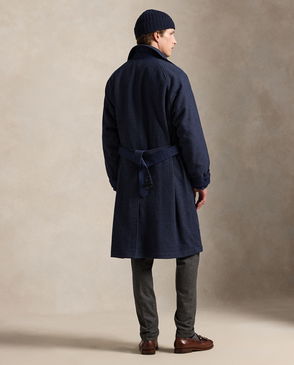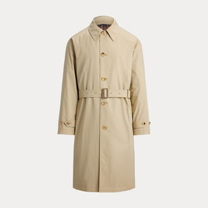 In brushed Italian twill, this heritage-inspired trench coat is thoughtfully constructed with soft plaid lining and suede-covered buckles.