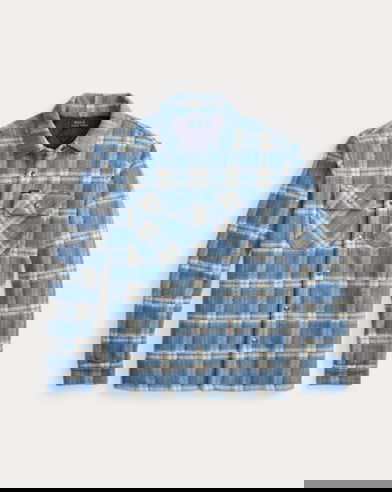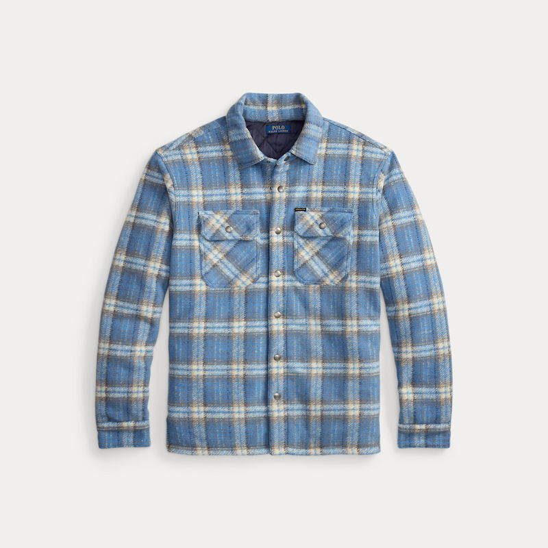 This plaid overshirt elevates a classic workwear silhouette with felted wool jacquard and down-alternative fill, seamlessly merging form and function.