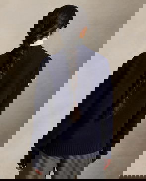 This chunky-knit jumper combines over 15 cotton yarns to depict our iconic mascot, the Polo Bear. In addition to embroidered details, the bear's outfit features glass-bead necklaces and fabric-appliquéd patchwork jeans.