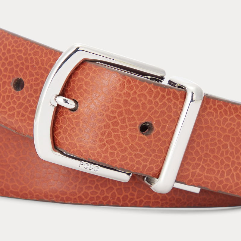 Made from full-grain cow leather, this men's dress belt reverses from a smooth side to a pebbled side, each embossed to bring out its distinctive grain.