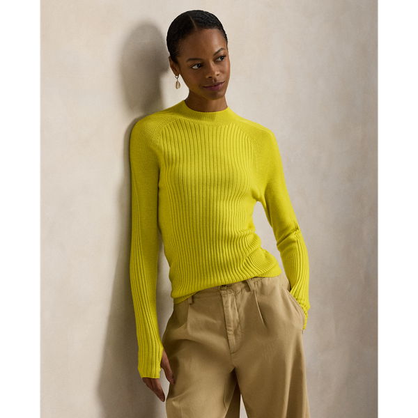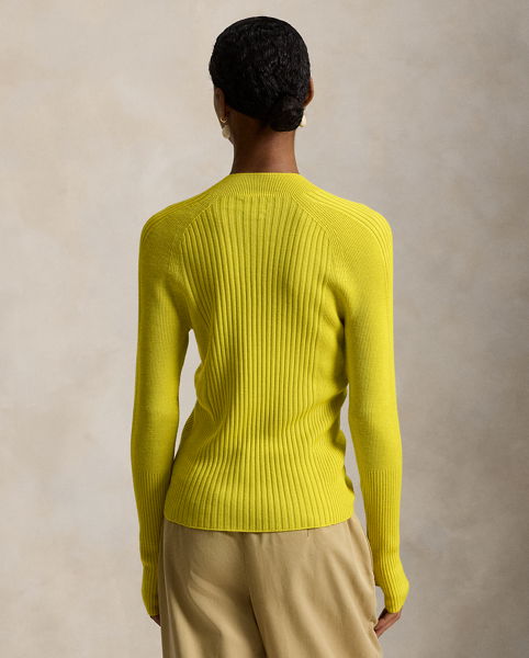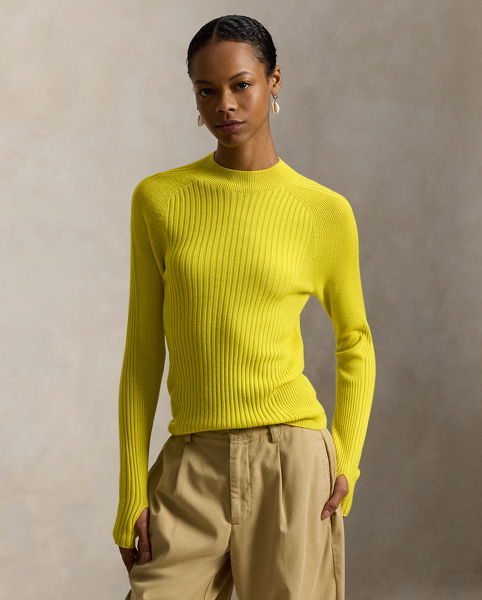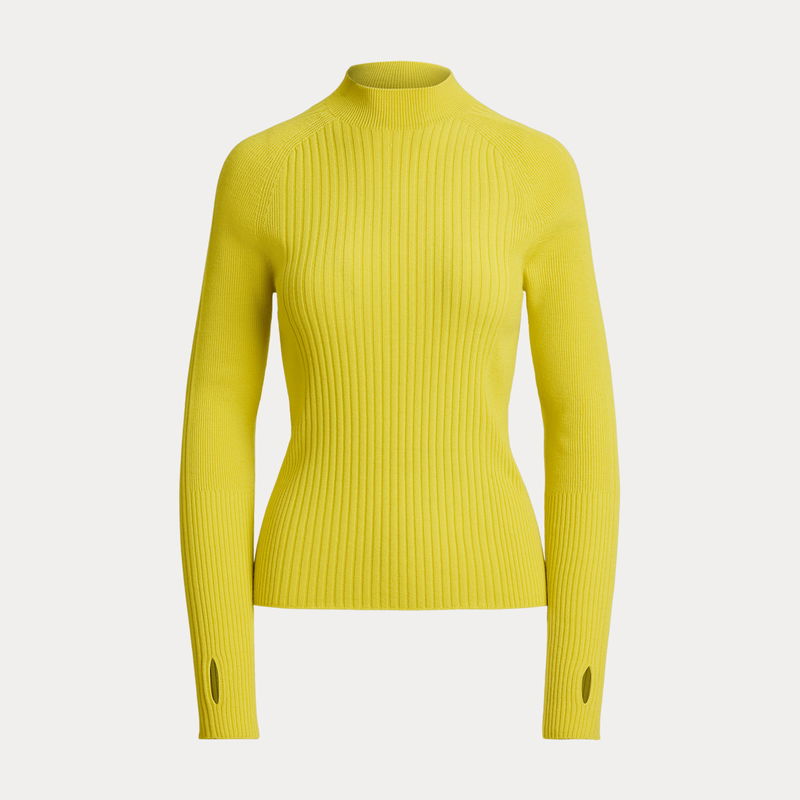 Crafted with medium-weight wool, this mockneck, raglan-sleeve jumper is knitted for a slim silhouette, featuring an all-over rib-knit construction and thumbholes above the cuffs.