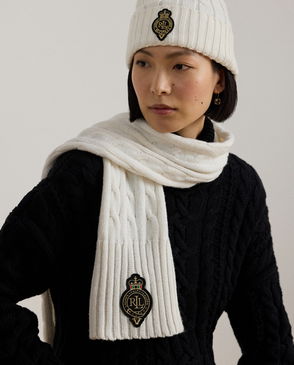 Knit with a blend of merino wool, cotton and linen, this scarf features a snowflake motif, geometric patterns and marled portions with subtle highs and lows throughout.