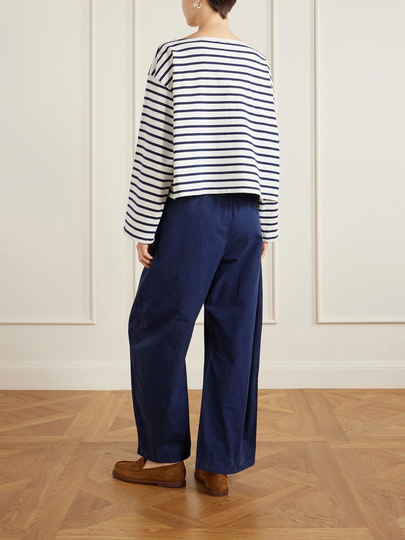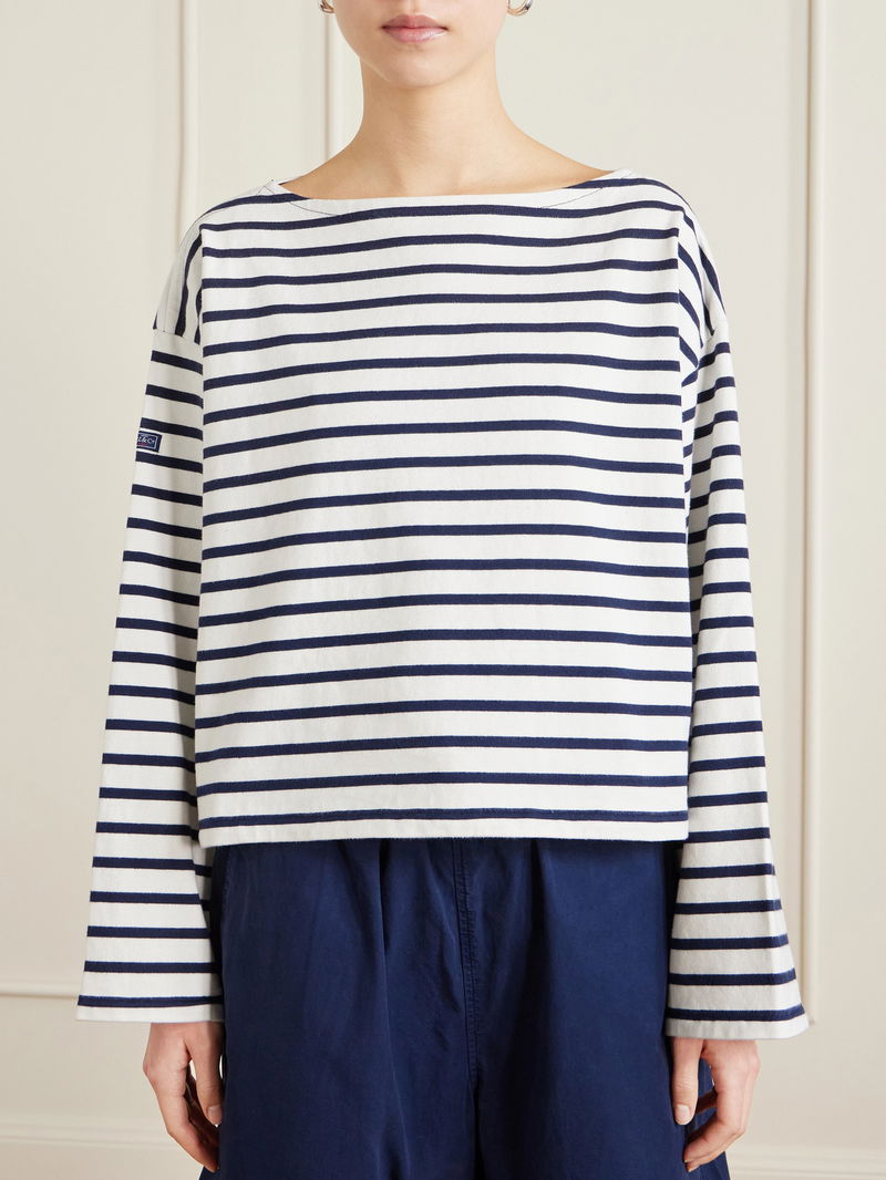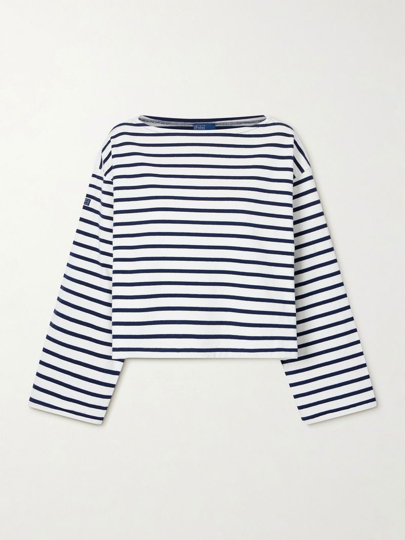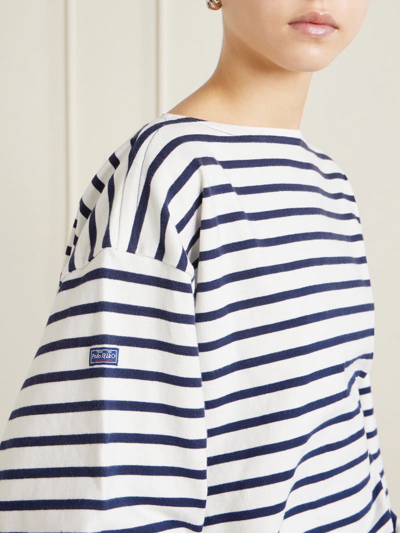 Polo Ralph Lauren's T-shirt is modeled on the mariniere , with its slim, navy and white stripes. It's cut from pure cotton in a relaxed, boxy silhouette and has a wide boat neck and fluted sleeves.