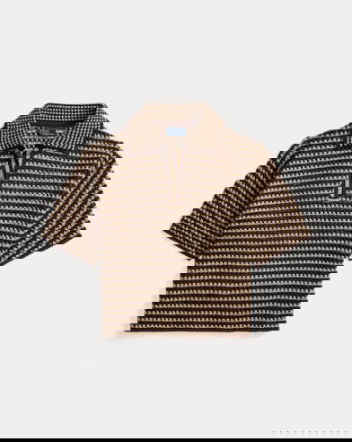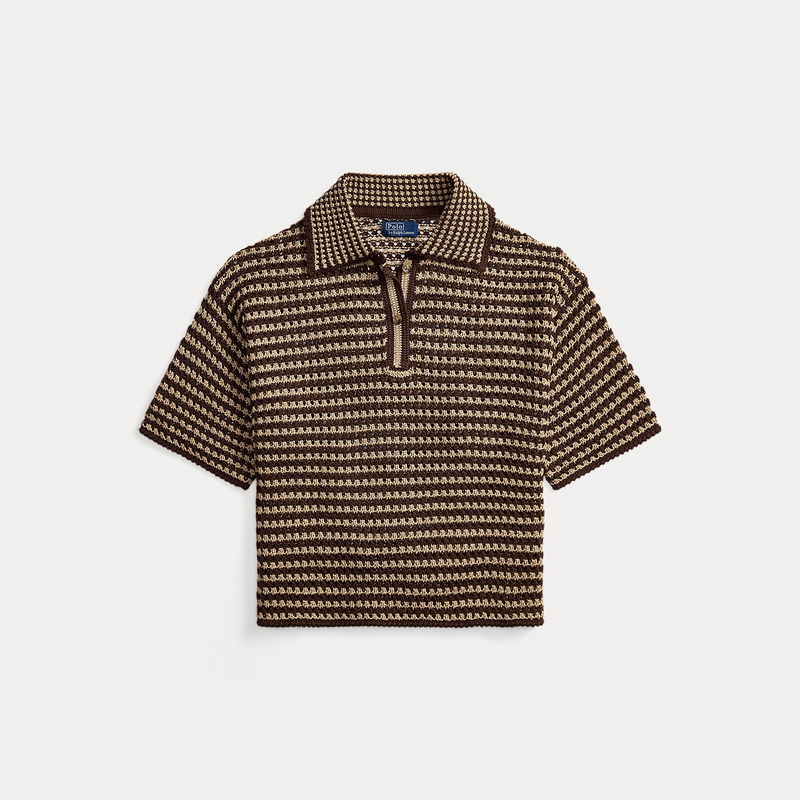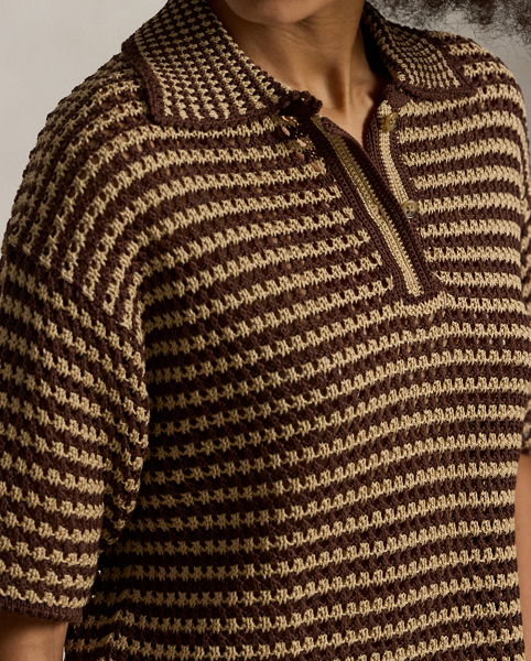 Inspired by the classic Polo shirt, this open-knit version features striped pointelle stitchwork and crocheted scalloped trim in a rich, neutral palette.