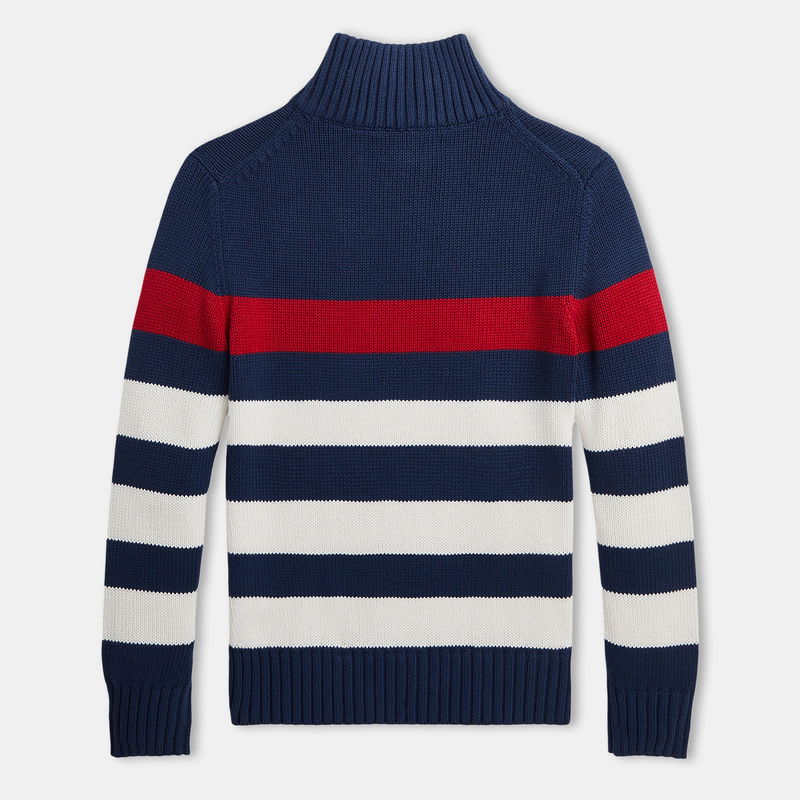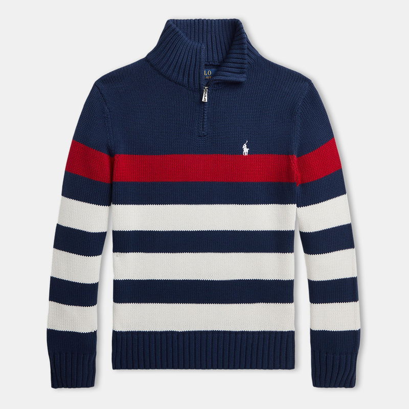 Elevate your young one's wardrobe with the stylish Striped Quarter-Zip Sweater from Polo Ralph Lauren. Crafted from 100% cotton, the sweater offers the perfect combination of warmth and breathability. The regular fit and straight hem provide a classic silhouette, while the quarter-zip placket and rib-knit mock neck add a contemporary twist to the design. Featuring long sleeves and ribbed trims completing the look with effortless sophistication. Designed in navy with striking red and white striped detailing offering a visual appeal, while the signature embroidered Pony at the left chest pays tribute to the brand's heritage. Whether your youngster is attending a family event or having a casual day out, the Polo Ralph Lauren Striped Quarter-Zip Sweater is the perfect piece for any occasion. Pair with tailored trousers or jeans for a complete