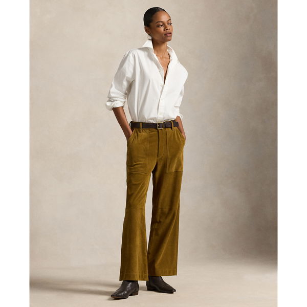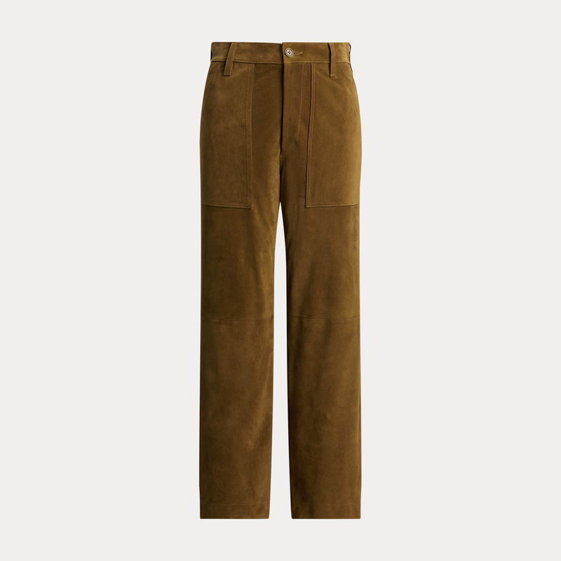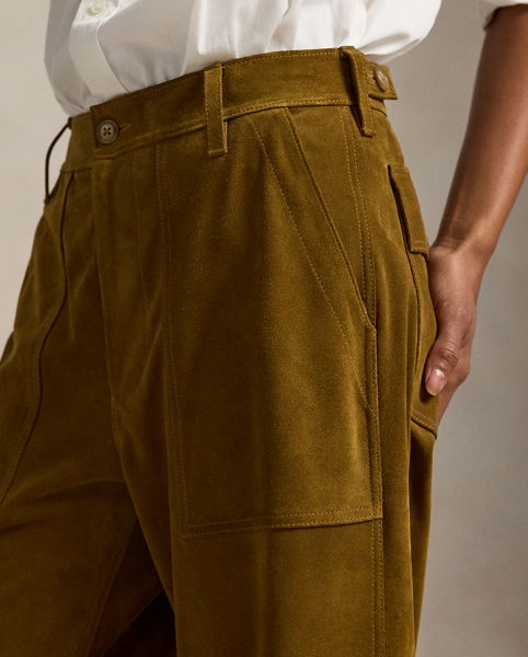 This version of the Ricky trouser is crafted with roughout suede, chosen for its rugged patina and fluid drape. Designed for a wide-leg, cropped fit, it maintains signature details of the original, including adjustable button tabs at the waist and utility-inspired pocketing.