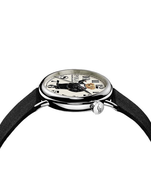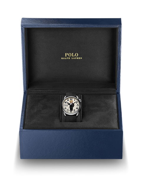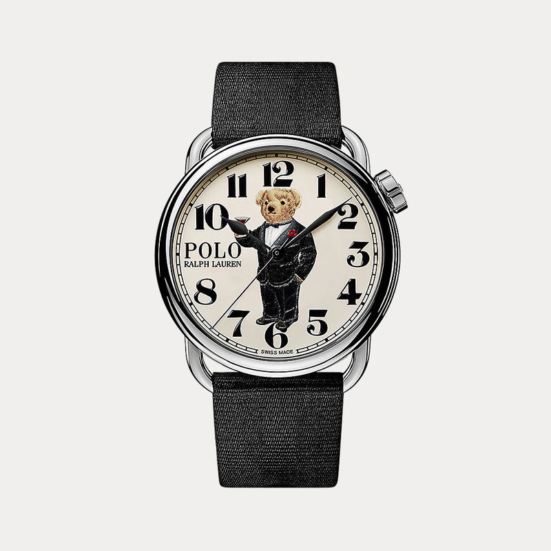 The Polo Bear watch collection merges the time-honoured traditions of Swiss watchmaking with a beloved icon from the World of Ralph Lauren Lauren. Each bear in this collection is inspired by Ralph Lauren Lauren's own way of dressing and the signature themes of his timeless designs. Printed on the dial, the debonair Martini Bear – complete with boutonnière and embroidered velvet slippers – captures the rakish confidence of Edwardian gentlemen and 1930s Hollywood movie stars, some of the inspirations behind Mr. Lauren's love of the timeless tuxedo.