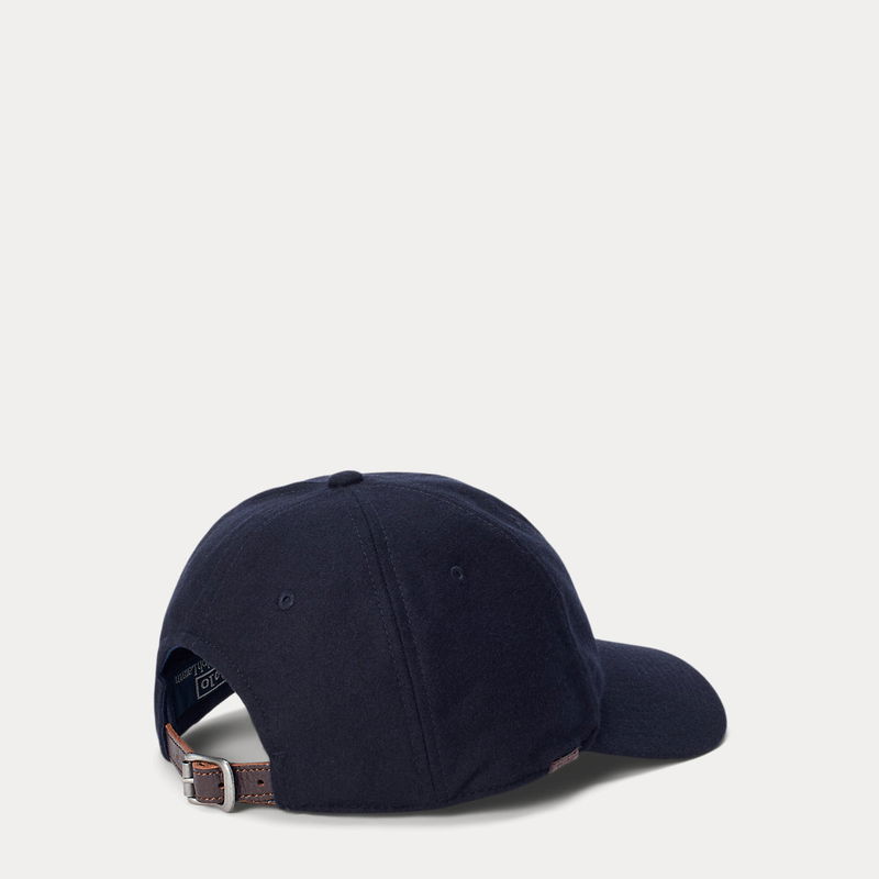 This classic ball cap is realised in wool flannel and finished with a buckled leather strap on the back.