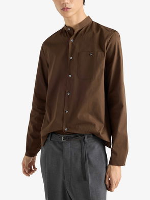 Prada cotton shirt. Exposed button fastenings to the front. Relaxed fit, camp collar, short sleeves, Mother of Pearl buttons, patch pocket to the chest, fabric triangle brand appliqué to the pocket, contrast piping.