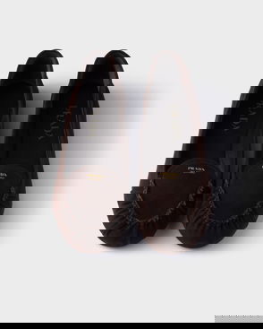 Prada suede loafers. Almond toe, apron stitching, penny strap, foiled branding, leather-covered heel.