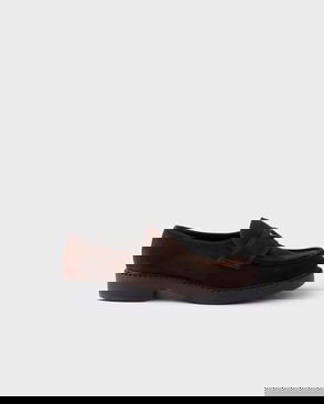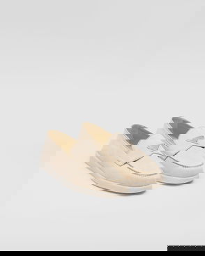 Prada suede loafers. Almond toe, apron stitching, penny strap, triangle brand plaque at penny strap, flat sole.