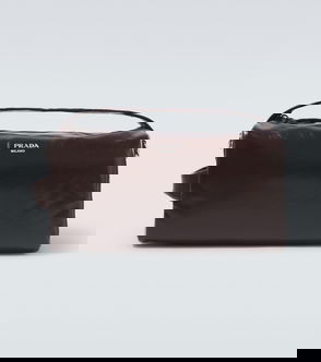 Zip fastening. Detachable, adjustable nylon and leather shoulder strap, ring on the shoulder strap for keyring trick, enamelled metal triangle logo on the front, all-over crosshatch texture, waxed finish, one main interior compartment, card slot to the interior, logo-print Re-Nylon lining.