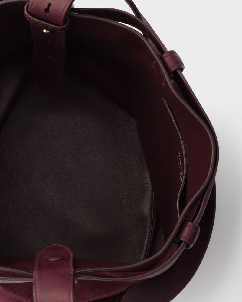 Buckle belted suede bucket bag. Decorative belt with buckle.