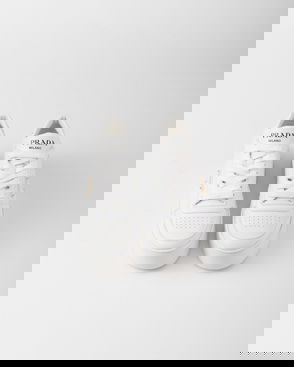 Prada leather low-top trainers. Lace-up fastening. Closed round toe, perforated toe, brand plaque at side, typography at tongue, chunky platform sole.